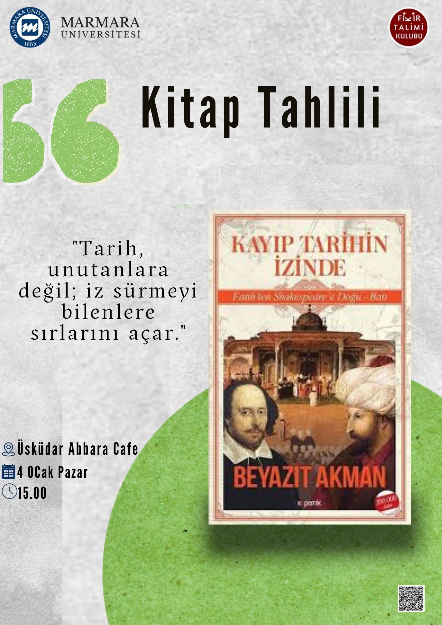 “Beyazıt Akman Kayıp Tarihin İzinde Kitap Tahlili” etkinliği, katılımcıların tarihî roman türünü daha yakından tanımasını ve tarih bilincini edebiyat aracılığıyla derinleştirmesini amaçlamaktadır. Etkinliğin hedefi, öğrencilerin tarihî olayları farklı bir bakış açısıyla değerlendirmesini sağlamak, aynı zamanda düşünsel paylaşım ortamı oluşturarak okuma kültürünü desteklemektir. Hedef kitle; edebiyat, tarih ve kültür alanlarına ilgi duyan üniversite öğrencileri ile kulüp üyeleridir. Bu etkinlik, Beyazıt Akman’ın Kayıp Tarihin İzinde eserinden hareketle, geçmişin izlerini bugüne taşıyan temalar üzerine sohbet edilmesini ve katılımcıların tarih ile edebiyat arasındaki bağı keşfetmelerini amaçlamaktadır.