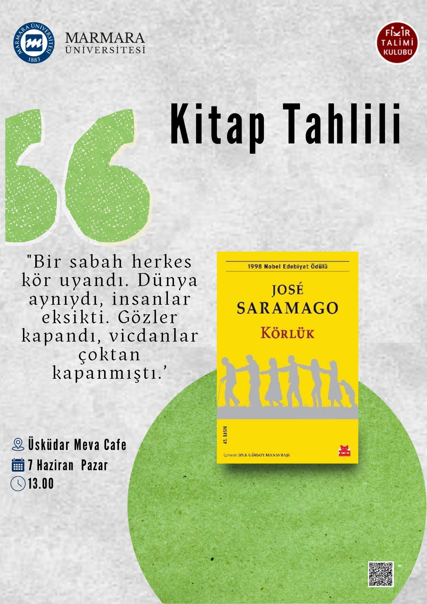 José Saramago’nun Körlük eseri üzerine düzenlenecek bu etkinlik, birey ve toplum ilişkisini, etik değerlerin çöküşünü ve insan doğasının kriz anlarındaki dönüşümünü edebiyat ekseninde ele almayı amaçlamaktadır. Etkinliğin hedefi; katılımcıların toplumsal körlük, vicdan, otorite ve dayanışma kavramlarını eleştirel bir bakış açısıyla değerlendirebilme becerilerini geliştirmektir. Üniversite öğrencileri başta olmak üzere edebiyat ve düşünsel tartışmalara ilgi duyan herkese açık olan bu etkinlik, yalnızca bir distopya tahlili yapmak için değil; modern dünyanın görünmeyen kırılganlıklarını fark etmek ve “insan kalabilme” so