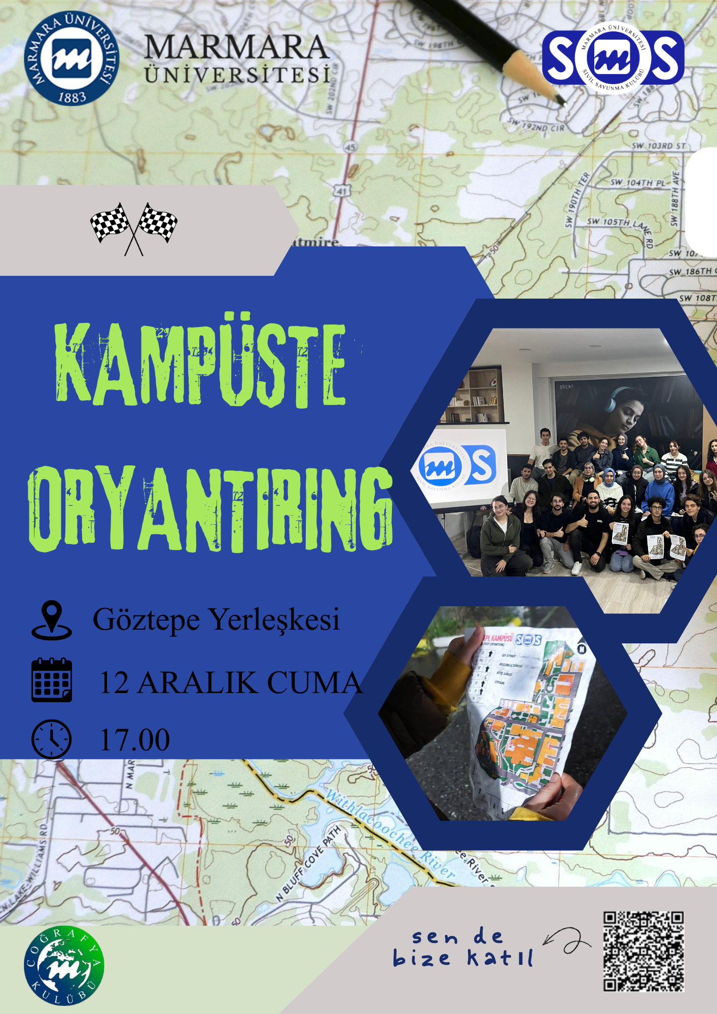 Etkinliğin Konusu: Marmara Üniversitesi Sivil Savunma Kulübü ve Marmara Coğrafya Kulübü iş birliğiyle gerçekleştirilecek olan oryantiring etkinliği; harita okuma, pusula kullanımı, yön bulma teknikleri ve arazi üzerinde rota belirleme uygulamalarını içeren bir doğa temelli sportif aktivitedir. Etkinliğin Amacı: Bu etkinlik ile katılımcıların yön bulma becerilerini geliştirmeleri, temel oryantiring tekniklerini uygulamalı olarak öğrenmeleri, takım çalışması ve problem çözme yeteneklerini güçlendirmeleri amaçlanmaktadır. Ayrıca, öğrencilerin doğa farkındalığını artırmak, fiziksel aktivite yoluyla dayanıklılık kazandırmak ve iki kulüp arasında iş birliğini pekiştirmek hedeflenmektedir. Hedef Kitlesi: Marmara Üniversitesi öğrencileri ve personeli