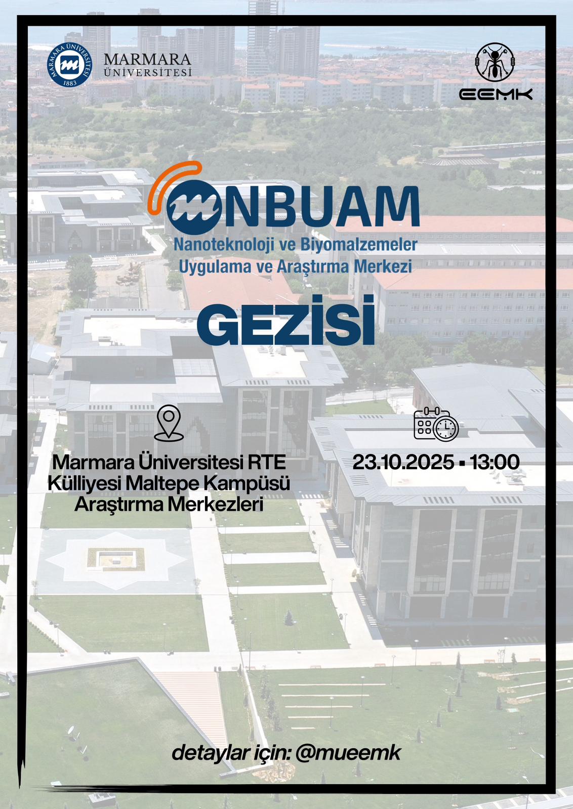 Kulübümüz tarafından 9 Ekim 2025 Perşembe günü, saat 13:00'te Marmara Üniversitesi RTE Külliyesi Maltepe Kampüsü'nde yer alan Nanoteknoloji ve Biyomalzemeler Uygulama ve Araştırma Merkezi'ne (ONBUAM) yönelik bir teknik gezi düzenlenmesi planlanmaktadır. Bu etkinliğin temel amacı, öğrencilerimize nanoteknoloji ve biyomalzeme gibi hızla gelişen ve disiplinlerarası öneme sahip alanlardaki güncel bilimsel çalışmaları, ileri teknoloji laboratuvar imkanlarını ve araştırma altyapılarını yerinde tanıtmak ve bu konulardaki farkındalıklarını artırmaktır. Gezi kapsamında katılımcılar, merkezin faaliyetleri hakkında uzmanlardan bilgi alacak ve yapılan araştırmaları gözlemleme fırsatı bularak teorik bilgilerini pratik uygulamalarla pekiştirecektir. Bu deneyimin, öğrencilerimizin akademik vizyonlarına ve kariyer planlamalarına önemli ölçüde katkı sağlayacağına inanıyoruz.