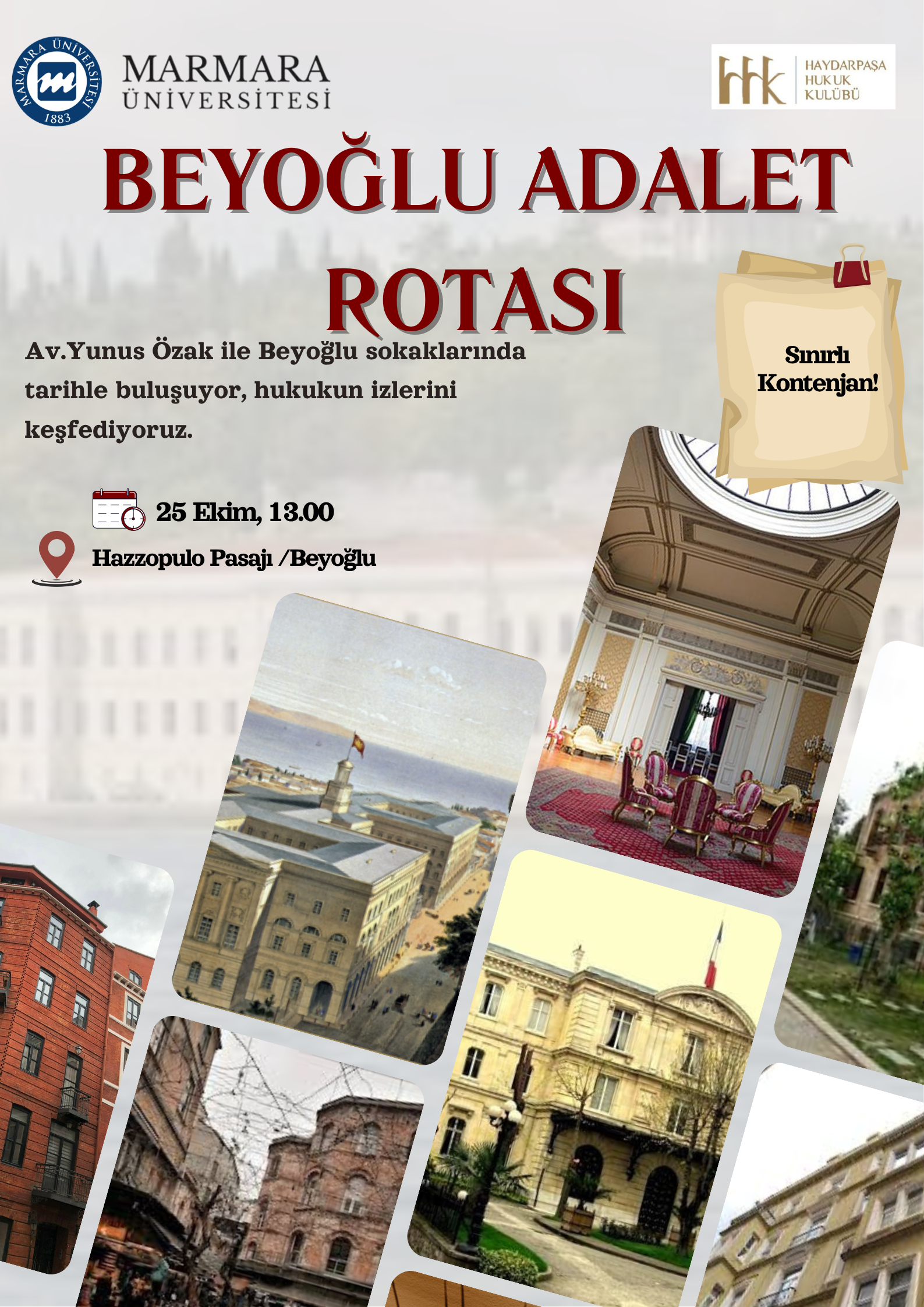 Marmara Üniversitesi Haydarpaşa Hukuk Kulübü olarak Beyoğlu’nun kalbinde düzenlenen özel bir hukuk ve kültür rotası tasarladık. Masterlaw Hukuk Bürosu’nun kurucu ortaklarından Av. Yunus Özak ile gerçekleştireceğimiz bu etkinlikte, şehrin adaletle, mimariyle ve kültürel mirasla örülmüş izlerini takip edeceğiz. Rotada Neler Var? Rotamızda toplam 9 durak bulunuyor: Namık Kemal’in izlerinden Galatasaray Lisesi’nin hukuki mirasına, Venedik Sarayı’nın diplomasi tarihinden Fransız Mahkemesi’nin ilginç cephesine kadar hem kültürel hem hukuki hafızaya yolculuk yapacağız. Etkinlik boyunca 2 molamız olacak, yaklaşık 2.5 saat sürecek bu keyifli rota boyunca tarihe tanıklık edeceğiz.