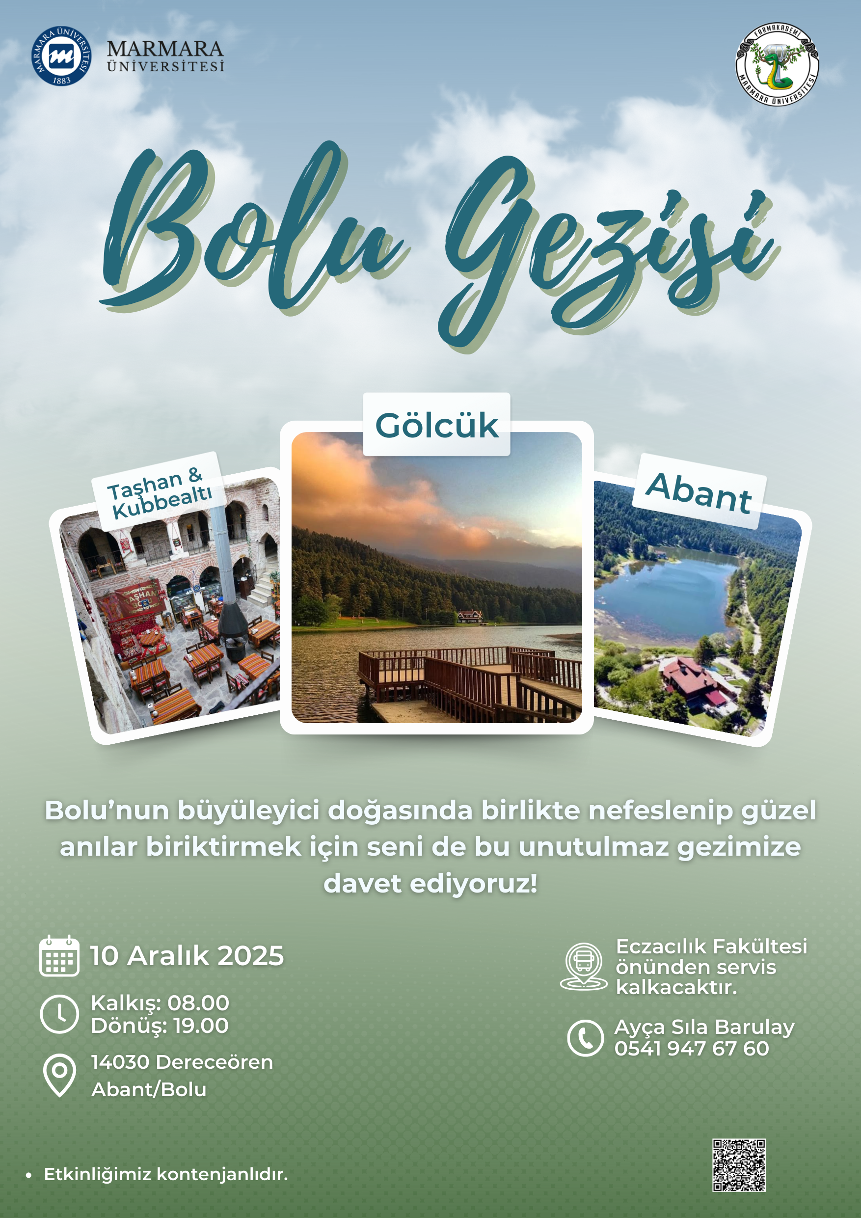 FarmAkademi olarak Marmara Üniversitesi Eczacılık Fakültesi öğrencileri için düzenlenecek Bolu Gezisi, 10 Aralık 2025 tarihinde gerçekleştirilecektir. Etkinlik kapsamında rotamız sırasıyla Taşhan Kubbealtı, Gölcük Tabiat Parkı ve Abant Gölü olacak; öğrencilerimizin hem doğayla iç içe huzurlu bir gün geçirmeleri hem de birlikte keyifli anılar biriktirmeleri amaçlanacaktır. Taşhan’ın tarihi atmosferinin deneyimlenmesinin ardından Gölcük’ün sakin doğasında yürüyüş imkânı sunulacak, son olarak Abant Gölü’nün eşsiz manzarası eşliğinde serbest zaman verilecektir. Gezi, saat 08.00’de fakülte önünden hareket edecek otobüsle başlayacak ve 19.00’da dönüşle tamamlanacaktır. Etkinlik süresince FarmAkademi ekibi tarafından koordinasyon sağlanacaktır.