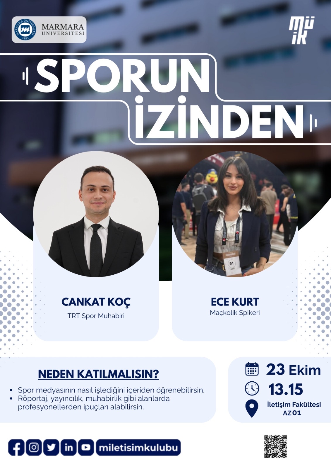Spor haberciliği alanında çalışan TRT Spor Muhabiri Cankat Koç ve Maçkolik Spikeri Ece Kurt ile spor medyası ile ilgili söyleşi gerçekleştirilecek.Bir moderatör eşliğinde söyleşi yapılacak.Soru-cevap şeklinde ilerlenecek.Etkinliğin hedef kitlesi üniversitemizin öğrencileri olacak.Yapılma amacı ise spor haberciliğine ilgi duyan öğrencileri bilgilendirmek ve merak ettikleri soruları cevaplandırmaktır.