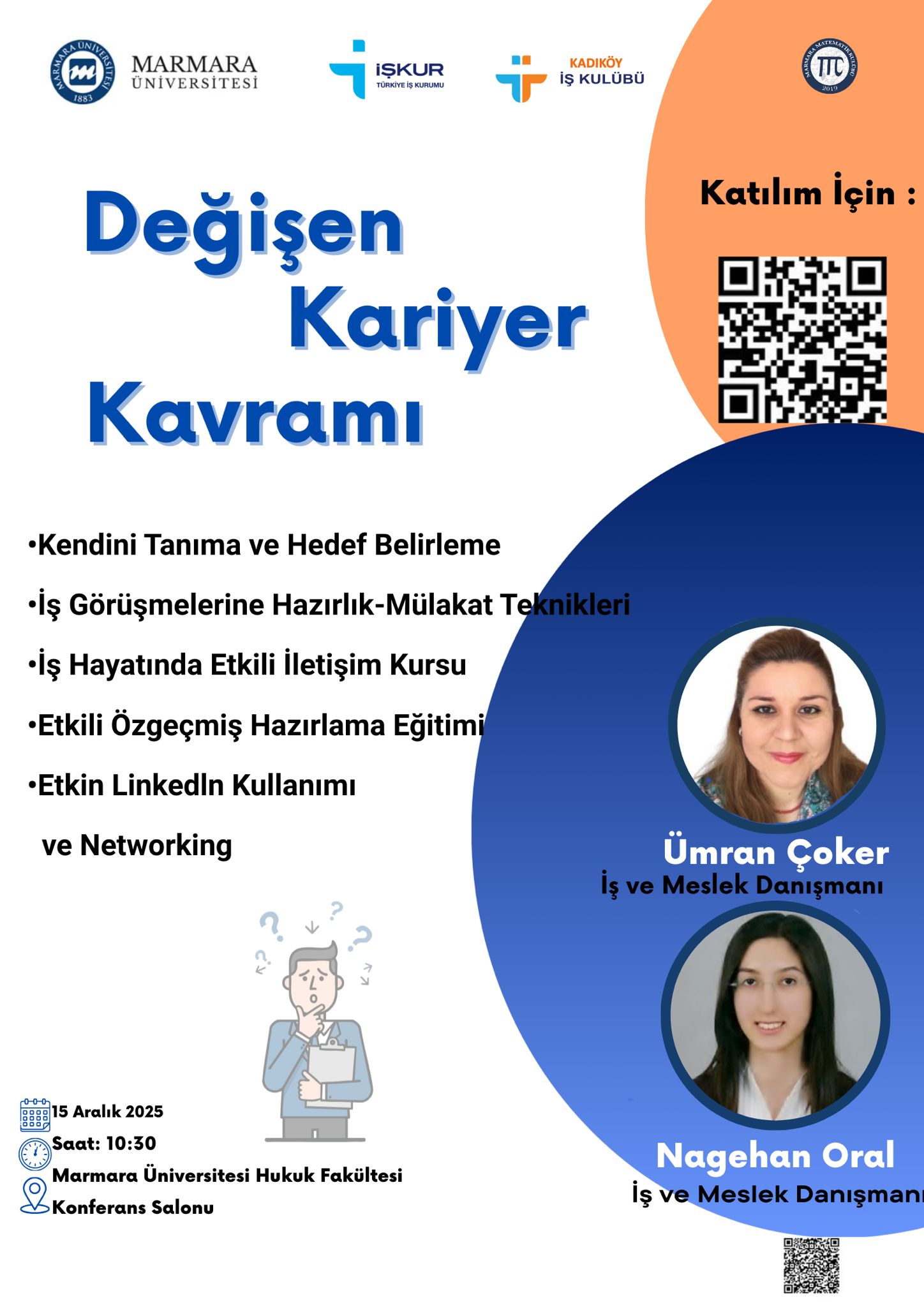 Türkiye İş Kurumu işbirliği ile düzenleyeceğimiz bu etkinlikte öğrenci arkadaşlarımıza yol gösterecek, ilham verecek konular ele alınacaktır. İş ve Meslek Danışmanları Ümran Çoker ve Nagehan Oral'ın katılımlarıyla gerçekleşecek bu etkinlikte; - Kendini Tanıma ve Hedef Belirleme - İş Görüşmelerine Hazırlık-Mülakat Teknikleri - İş Hayatında Etkili İletişim Kursu - Etkili Özgeçmiş Hazırlama Eğitimi - Etkin LinkedIn Kullanımı ve Networking konuları ele alınacaktır. Öğrenci arkadaşlarımıza kariyer gelişimlerinde katkı sağlamak amacıyla bu etkinliği düzenleyeceğiz.