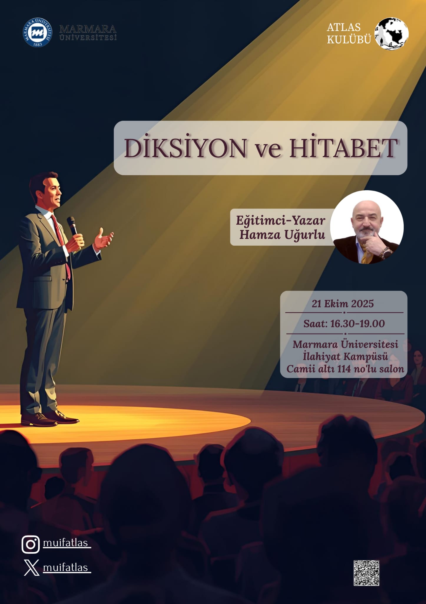 Atlas Kulübü olarak diksiyon ve hitabet atölyesi açmak istiyoruz . Bu etkinliğimizde Marmara Üniversitesi öğrencilerinin günümüzün önemli problemlerinden biri olan diksiyon ve hitabet eksikliği problemini gidermeyi amaçlamaktayız. Ayrıca bu etkinlikle katılımcılarımızın kendilerini daha iyi ifade edebilmesini ve çalıştıkları alan veya gündelik hayatlarını daha düzgün bir hitabet ve diksiyonla sürdürmelerini hedeflemekteyiz. Söz konusu etkinliğimizde kontenjanı 15 kişiyle sınırlamayı uygun gördük.