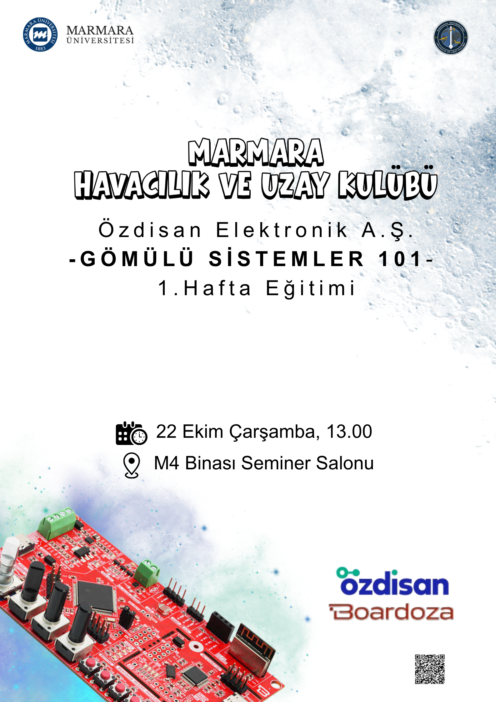 Eğitim Özdisan Elektronik A.Ş.’nin sponsorluğu ile gerçekleşerek, katılımcılara elektronik komponentler ve teknolojik uygulamalar hakkında güncel bilgiler sunmayı, uygulamalı örnekler ve sektörel deneyimler aracılığıyla teorik bilgilerin pekiştirilmesini hedeflemektedir. Belirlenen tarihte Gömülü Sistemler 101 Eğitimi'nin 1. hafta dersi öğrencilere verilecektir.