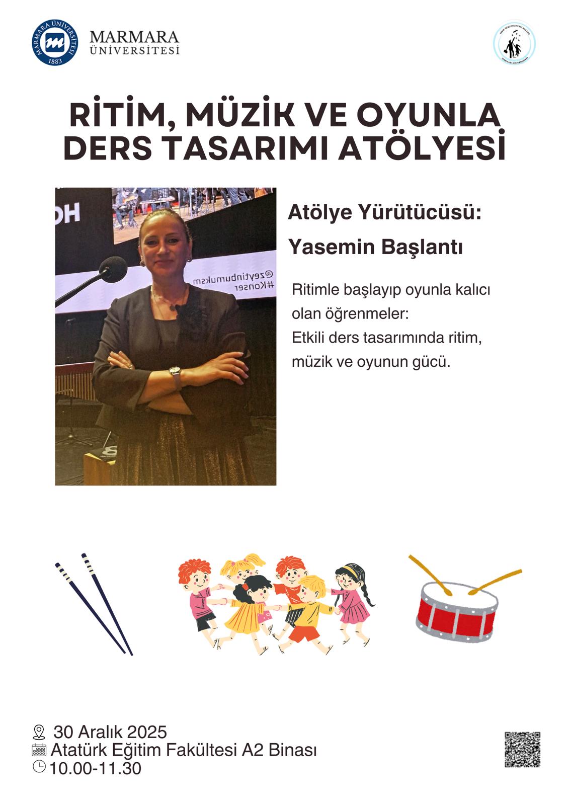 Ritim, Müzik ve Oyunla Ders Tasarımı Atölyesi; eğitim fakültesi öğrencilerinin ritim, müzik ve oyun temelli öğrenme yaklaşımlarını tanımalarını ve bu yöntemleri ders kazanımlarıyla ilişkilendirerek yaratıcı ders tasarımları geliştirmelerini amaçlayan uygulamalı bir etkinliktir. Atölye, öğretmen adaylarının öğrenci merkezli, eğlenceli ve kalıcı öğrenmeyi destekleyen etkinlikler planlama becerilerini geliştirmeyi hedeflemektedir.