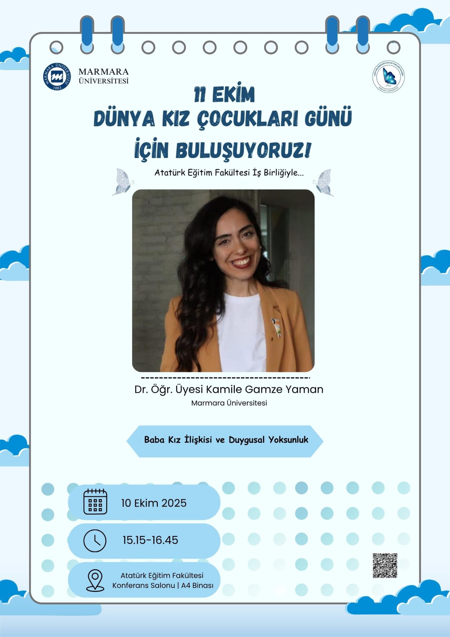 11 Ekim Dünya Kız Çocukları Günü adına Marmara Üniversitesi Mavi Kelebekler Çocuk Hakları Kulübü ve Atatürk Eğitim Fakültesi iş birliğinde bir konferans düzenlenecektir. Konferansta konuşmacı olarak Minnoş Gezgin lakabıyla bilinen sosyal medya fenomeni Çağla Gezgin ve Marmara Üniversitesi RPD Ana Bilim Dalı'ndan Doç. Dr. Hilal Çelik Ahbab yer alacaktır. Konferansın amacı 11 Ekim'e dikkat çekmek ve Marmara Üniversitesi mensuplarını bilinçlendirmektir. Konferans 10 Ekim tarihinde saat 14:00-17:00 aralığında sürecektir.