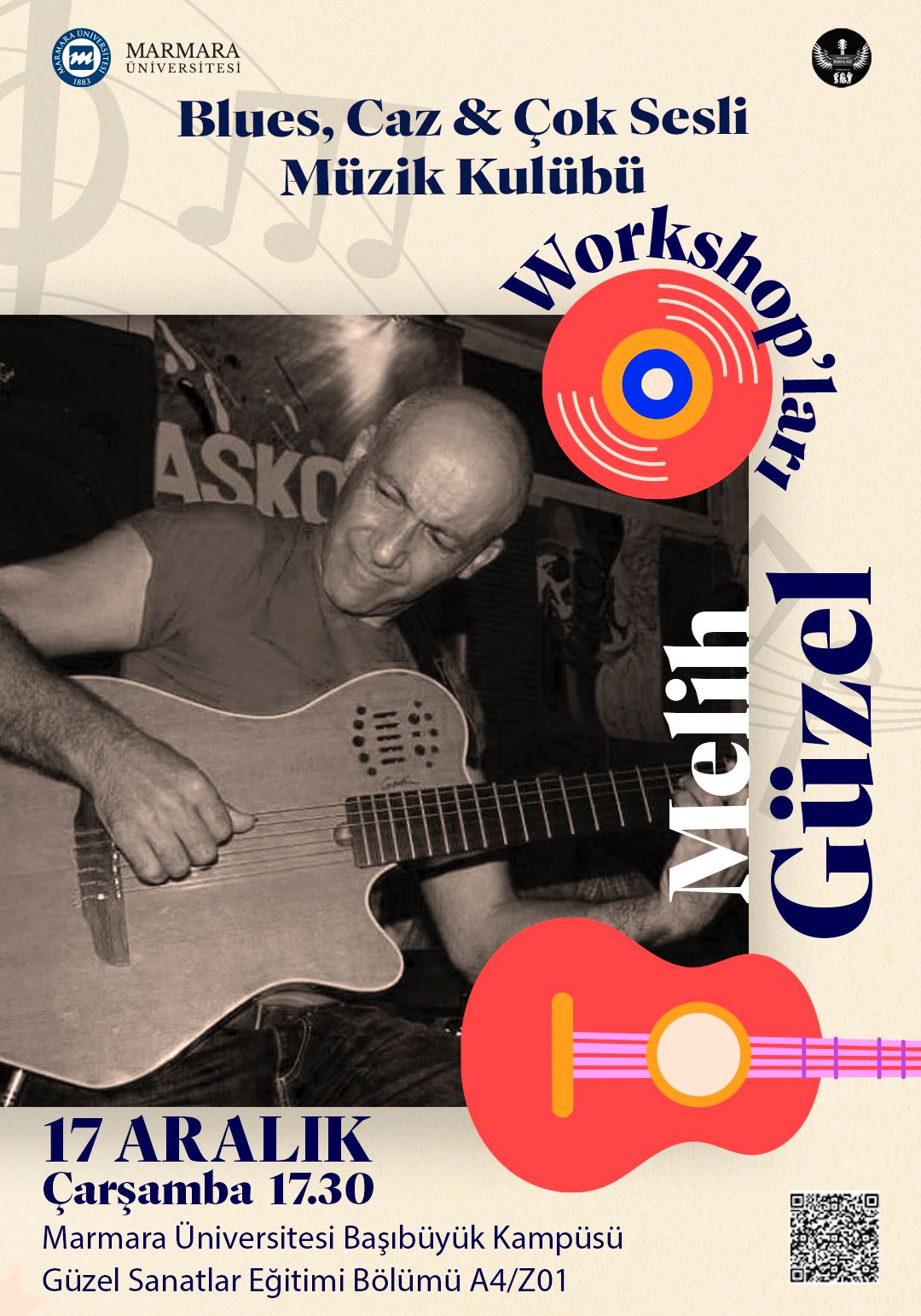 Workshoplarımızın amacı blues ve jazz müzik hakkında bilgi edinmek isteyen insanları bu alanda iyi müzisyenlerden bilgi alabilcekleri bir ortam ve fırsat yaratmaktır. Bu workshopumuzu da okulumuzda Müzik Öğretmenliği Anabilim dalında öğretim görevlisi olan Melih GÜZEL ile yapacağız.