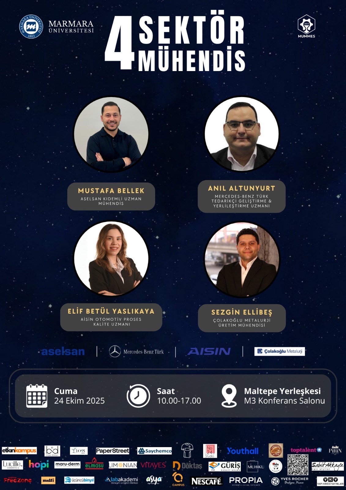 “4 Sektör 4 Mühendis” etkinliğinin temel amacı, mühendislik öğrencilerinin mezuniyet öncesinde farklı sektörleri tanıyarak kariyer yönelimlerini belirlemelerine yardımcı olmaktır. Farklı mühendislik alanlarında çalışan profesyonelleri bir araya getirerek, öğrencilerin teorik bilgilerini gerçek sektör deneyimleriyle ilişkilendirmelerini sağlamayı hedefler.Etkinliğin hedefi; öğrencilerin sektörel farkındalığını artırmak, iş hayatının gerekliliklerini ve farklı mühendislik dallarındaki fırsatları daha yakından tanıtmak, aynı zamanda ilham verici kariyer hikâyeleriyle motivasyonlarını güçlendirmektir. Ayrıca, katılımcıların profesyonellerle doğrudan iletişim kurarak ağ (network) oluşturmasına olanak tanımak da önemli bir hedeftir.Bu etkinliğin hedef kitlesi, başta mühendislik fakültesi öğrencileri olmak üzere; kariyerini şekillendirme aşamasında olan, farklı sektörlerdeki mühendislik uygulamaları hakkında bilgi edinmek isteyen tüm üniversite öğrencileridir.
