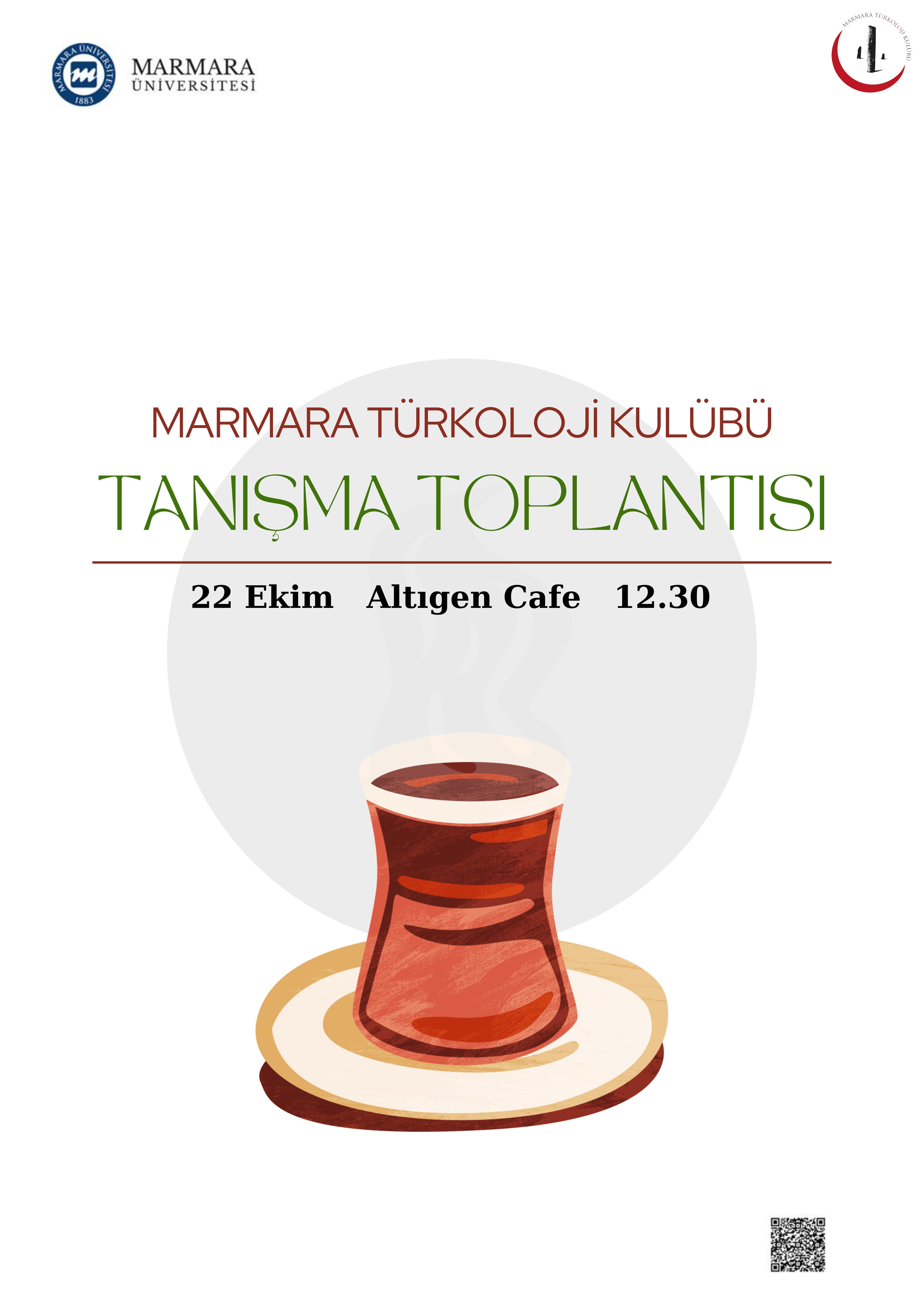 Marmara Türkoloji kulübü olarak yeni üyelerimize kulübümüzü tanıtma fırsatı yakalama ve kulübümüze yeni gelen üyelerimiz ile tanışma fırsatı yakalamak etkinliğimizin temel amacı. Kulübümüze üye olan herkesin katılımı ile gerçekleştirilecek sıcak bir çay içme etkinliği, ortak fikirler elde etmek ve yapılacak etkinlikler için tüm üyelerimizin fikirlerine başvurmak.
