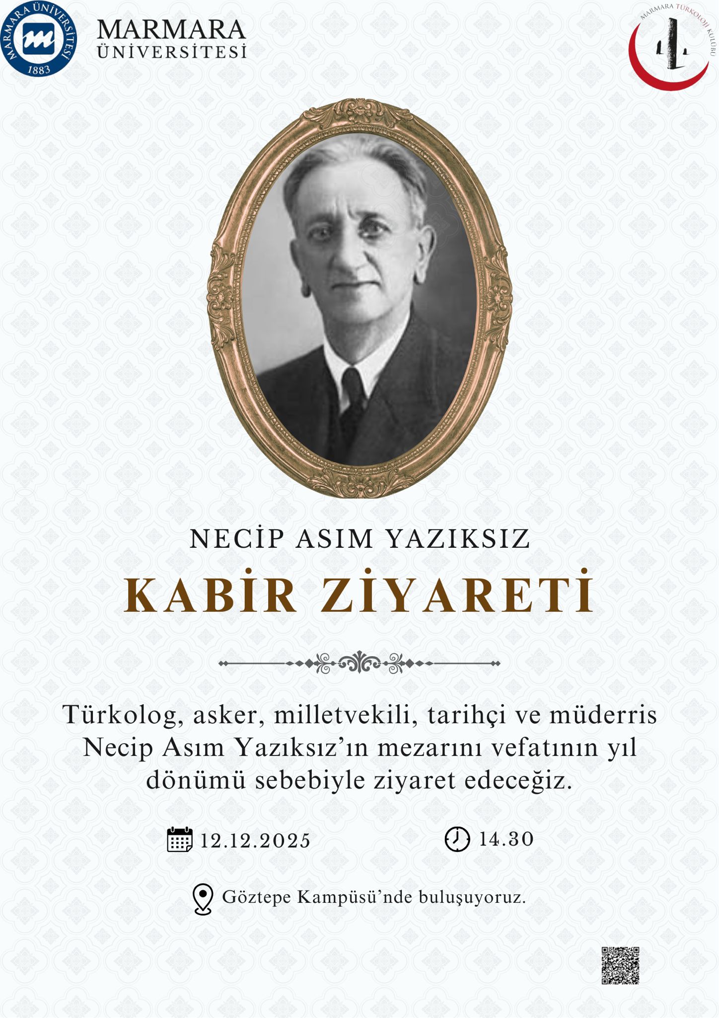 Türkolog, asker, milletvekili, tarihçi ve müderris Necip Asım Yazıksız'ın kabrini vefatının yıl dönümü sebebiyle ziyaret edeceğiz. Etkinliğimizin amacı türkolog Necip Asım Yazıksız'ı tanımak ve katılımcılarımıza tanıtmaktır. Vefat ettiği günde kabrini ziyaret ederek onu hatırlamak ve hatırlatmak amacımızdır. Etkinliğimiz okulumuzun tüm öğrencilerine yönelik yapılmaktadır.