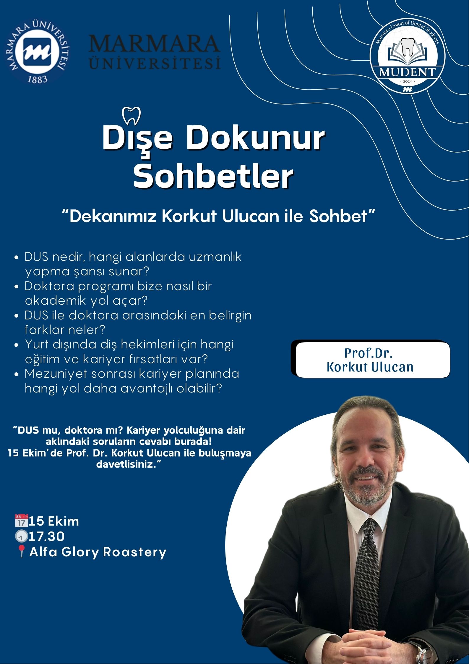 MUDENT’ten Yeni Sezona Merhaba! “Dişe Dokunur Sohbetler” serimizin yeni sezonunu fakültemizin dekanı Prof. Dr. Korkut Ulucan ile açıyoruz! Moleküler biyoloji, genetik ve özellikle epigenetik alanındaki değerli çalışmalarıyla bilime yön veren Prof. Dr. Ulucan; -DUS ve doktora programlarının farkları, -Yurt dışı akademik fırsatlar, -Epigenetik biliminin diş hekimliğine katkıları üzerine bizlerle keyifli bir sohbet gerçekleştirecek. Siz de hem kahvenizi yudumlayıp hem de hocamızın tecrübelerinden ilham almak istiyorsanız bu buluşmayı kaçırmayın. Yeni sezonun enerjisini birlikte yakalayalım!