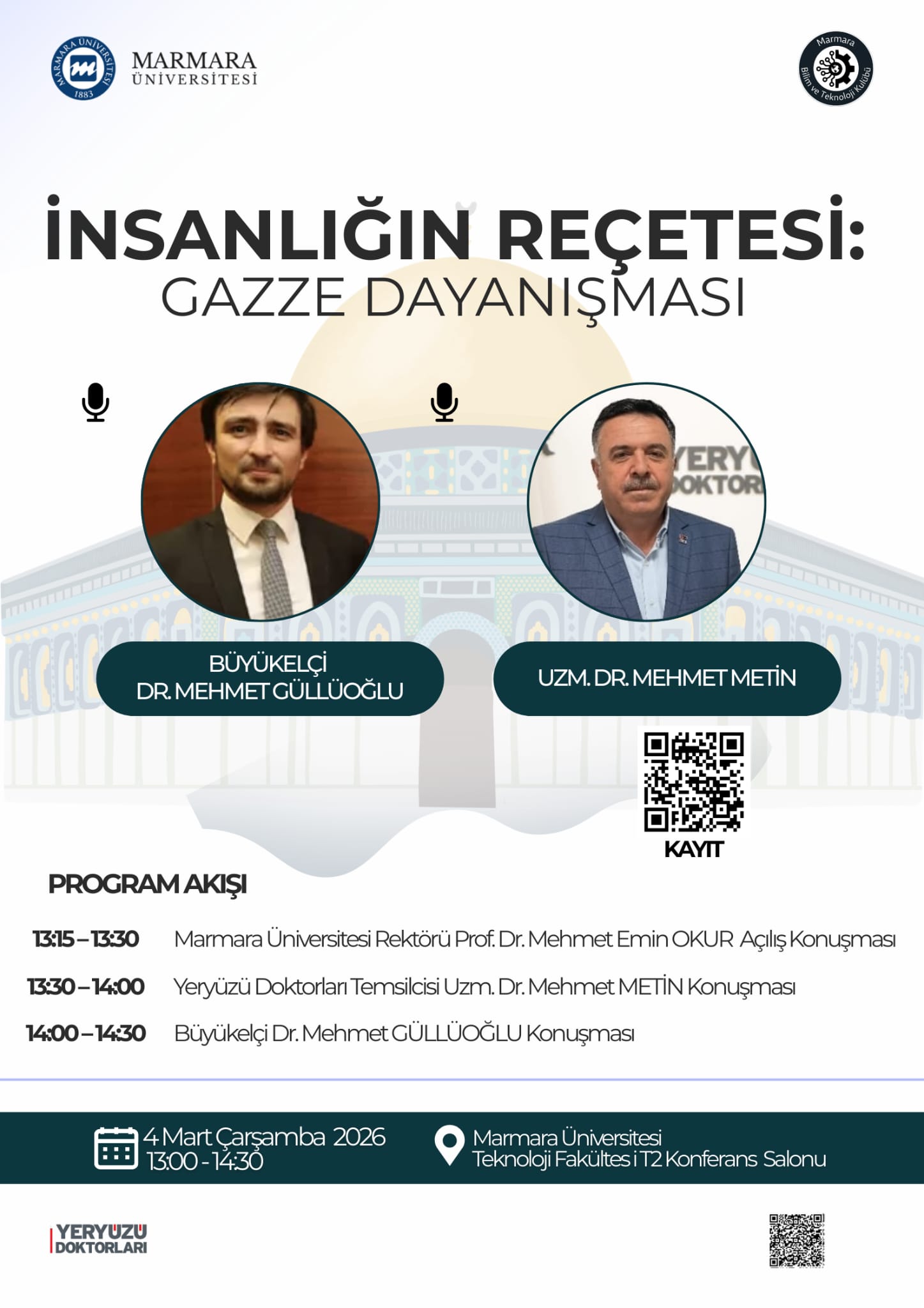 "İnsanlığın Reçetesi: Gazze Dayanışması" başlıklı bu etkinlik; Gazze bölgesinde devam eden insani kriz hakkında üniversite bünyesinde ve iş dünyasında üst düzey bir farkındalık oluşturmayı amaçlamaktadır. Etkinliğin temel hedefi, bölgedeki güncel durumu uzman konukların tecrübeleri ışığında katılımcılara aktarmak ve Yeryüzü Doktorları iş birliğiyle yürütülen insani yardım faaliyetlerine resmi bir zemin hazırlayarak toplumsal ve kurumsal dayanışma bilincini pekiştirmektir. Marmara Üniversitesi paydaşlarının yanı sıra, sosyal sorumluluk projelerine destek veren özel sektör temsilcileri ve firmaları da hedef kitle olarak belirleyen organizasyon; kriz bölgelerine yönelik akademik duyarlılığı artırmanın yanı sıra kurumsal bağış kanallarını harekete geçirmek, bölgedeki sağlık ve diplomasi süreçlerine dair doğru bilgiyi sunmak ve hem bireysel hem de kurumsal katılımcıları şeffaf bağış yöntemlerine yönlendirerek geniş kapsamlı bir toplumsal fayda sağlamak amacıyla düzenlenmektedir.