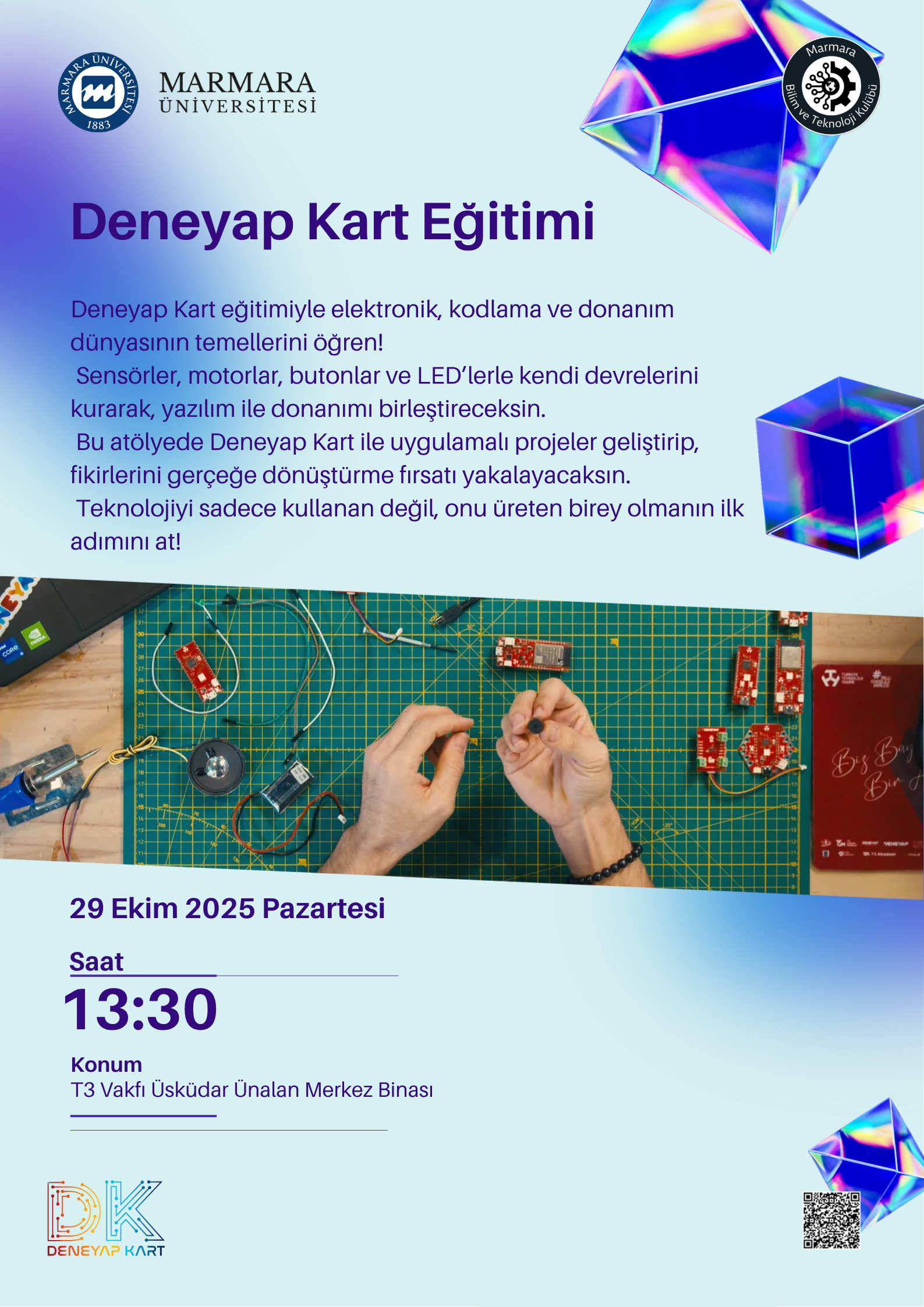 Deneyap Kart eğitimiyle elektronik, kodlama ve donanım dünyasının temellerini öğren! Sensörler, motorlar, butonlar ve LED’lerle kendi devrelerini kurarak, yazılım ile donanımı birleştireceksin. Bu atölyede Deneyap Kart ile uygulamalı projeler geliştirip, fikirlerini gerçeğe dönüştürme fırsatı yakalayacaksın. Teknolojiyi sadece kullanan değil, onu üreten birey olmanın ilk adımını at!