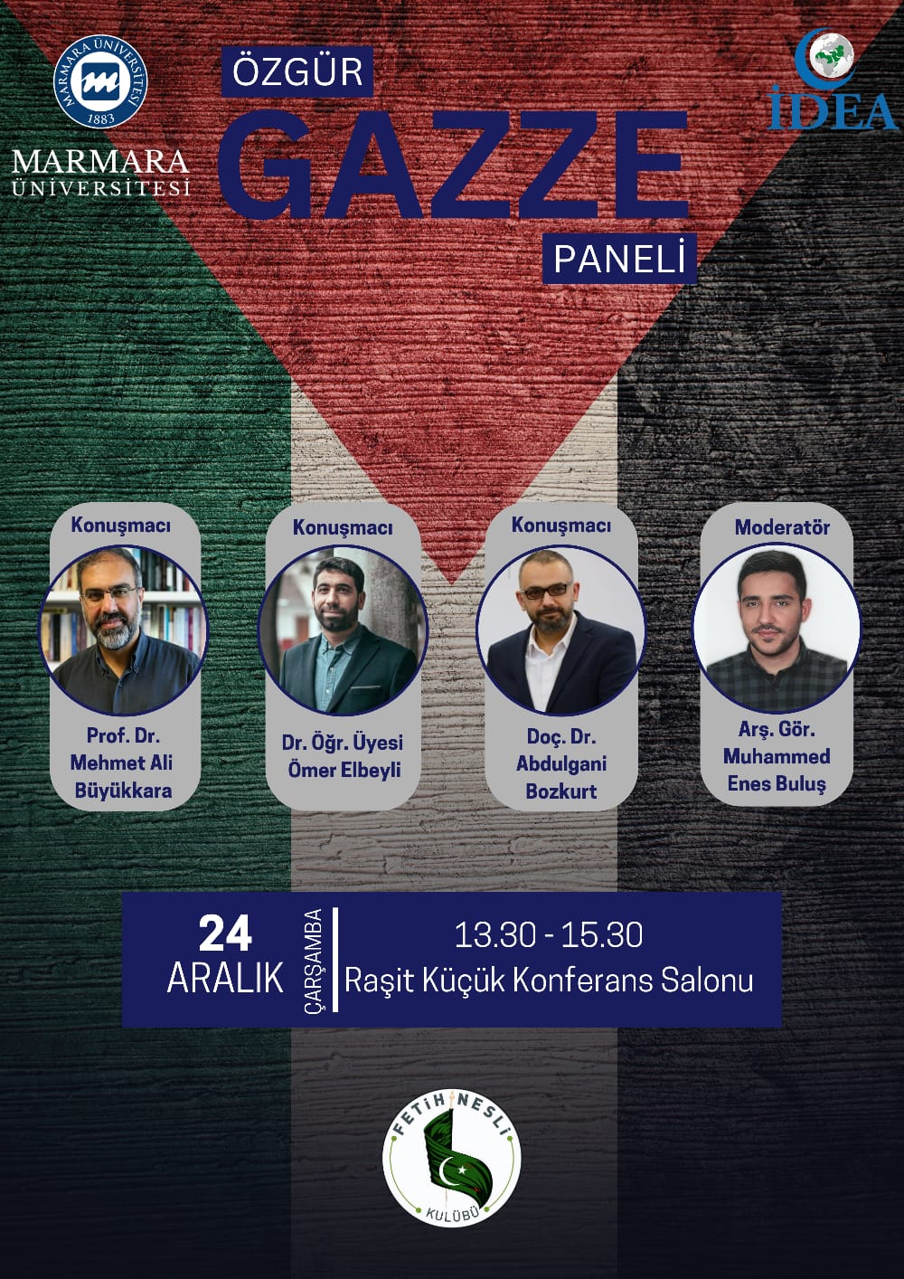 - Marmara İlahiyat Fakültesi öğrencileri (1. ve 2. öğretim), - Kudüs ve Filistin meselesine ilgi duyan herkes Bu Etkinliğin Yapılma Amacı: - Gazze’de 7 Ekim’den bu yana devam eden katliamların devam etmesine karşılık güncel durum üzerinden bir durum tespiti yapmak ve Gazze’nin tanıklığını ve direnişini anlamak, - Gençlerin gündeme dair olayları sorgulayıcı ve bilinçli bir şekilde değerlendirmesini sağlamak, - Siyonist işgalin tarihî ve güncel boyutlarını akademik bir zeminde ele almak, dile getirilmesi ihtiyacı, - Filistin meselesini sadece sosyal medya kampanyalarıyla değil, derinlikli bilgi ve bilinçle sahiplenmesini sağlamak, - Akademik bir ortamda düşünce paylaşımı ve teşvik edici bir ortam oluşturmak, - Katılımcılara model şahsiyetler ve direniş örnekleri sunarak bir misyon kazandırmak. Bu tür programlar, öğrencilerin gündemi yalnızca takip eden değil, yorumlayan ve ona karşı sorumluluk hisseden bireyler olmasını hedeflemektedir.