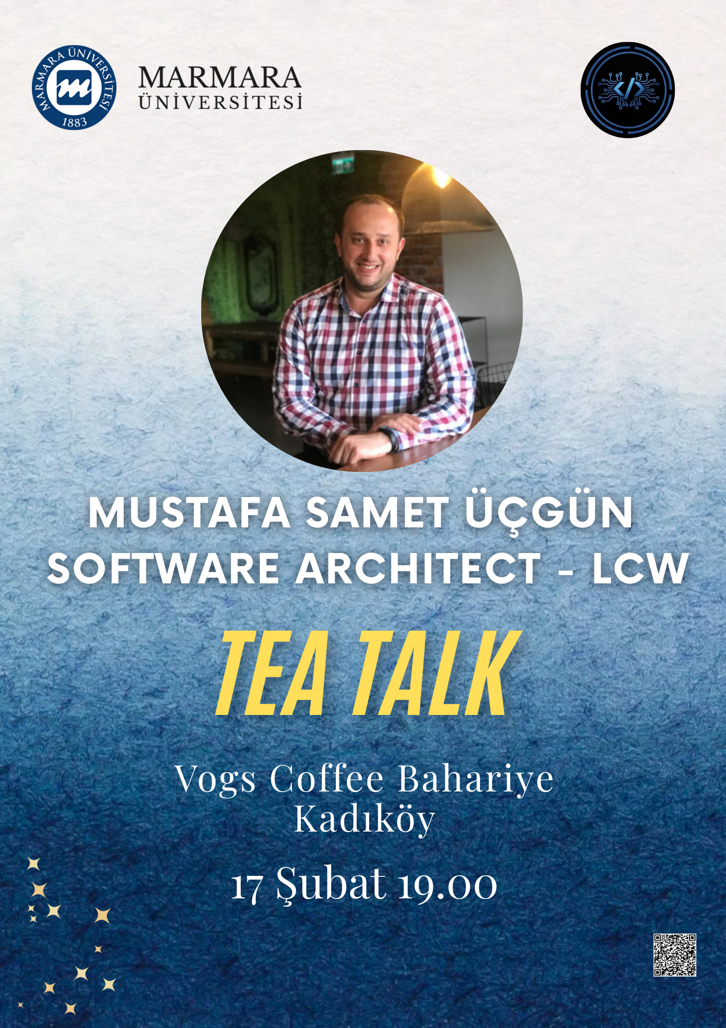 Etkinliğimiz sektörden deneyimli bir yazılım mimarıyla sohbet/söyleşi havasında bir kafede gerçekleşecektir. Hedef kitlemiz Marmara Üniversitesi öğrencilerinden yazılıma ilgi duyan ve bu alanda kendini geliştirmek isteyenlerdir. Katılımcıların yazılım ve teknoloji alanındaki sorularına cevap bulabileceği ve Mustafa Samet Üçgün'ün deneyimlerinden faydalanabileceği bir etkinlik olacaktır.