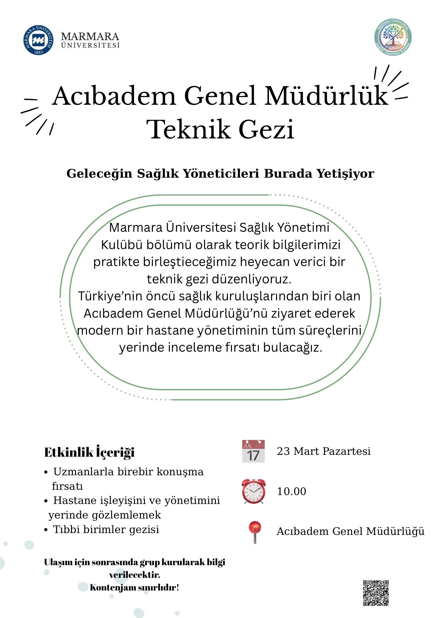 Acıbadem Hastanesi Teknik Gezisi, Marmara Üniversitesi Sağlık Yönetimi Kulübü tarafından sağlık yönetimi öğrencilerinin teorik olarak edindikleri bilgileri uygulama ortamında gözlemleyerek pekiştirmelerini sağlamak amacıyla düzenlenen bir etkinliktir. Bu etkinliğin hedef kitlesini başta Marmara Üniversitesi Sağlık Yönetimi bölümü öğrencileri olmak üzere sağlık sektöründe kariyer hedefleyen üniversite öğrencileri oluşturmaktadır. Teknik gezi kapsamında öğrencilerin modern bir hastanenin yönetim süreçlerini, hizmet sunumunu ve tıbbi birimlerin işleyişini yerinde incelemeleri, sağlık profesyonelleriyle birebir iletişim kurmaları ve sektör hakkında daha somut bir bakış açısı kazanmaları hedeflenmektedir. Böylece öğrencilerin mesleki farkındalıklarının artması, sağlık kurumlarının yönetim yapısını daha iyi anlamaları ve gelecekteki kariyer planlamalarına katkı sağlanması amaçlanmaktadır.