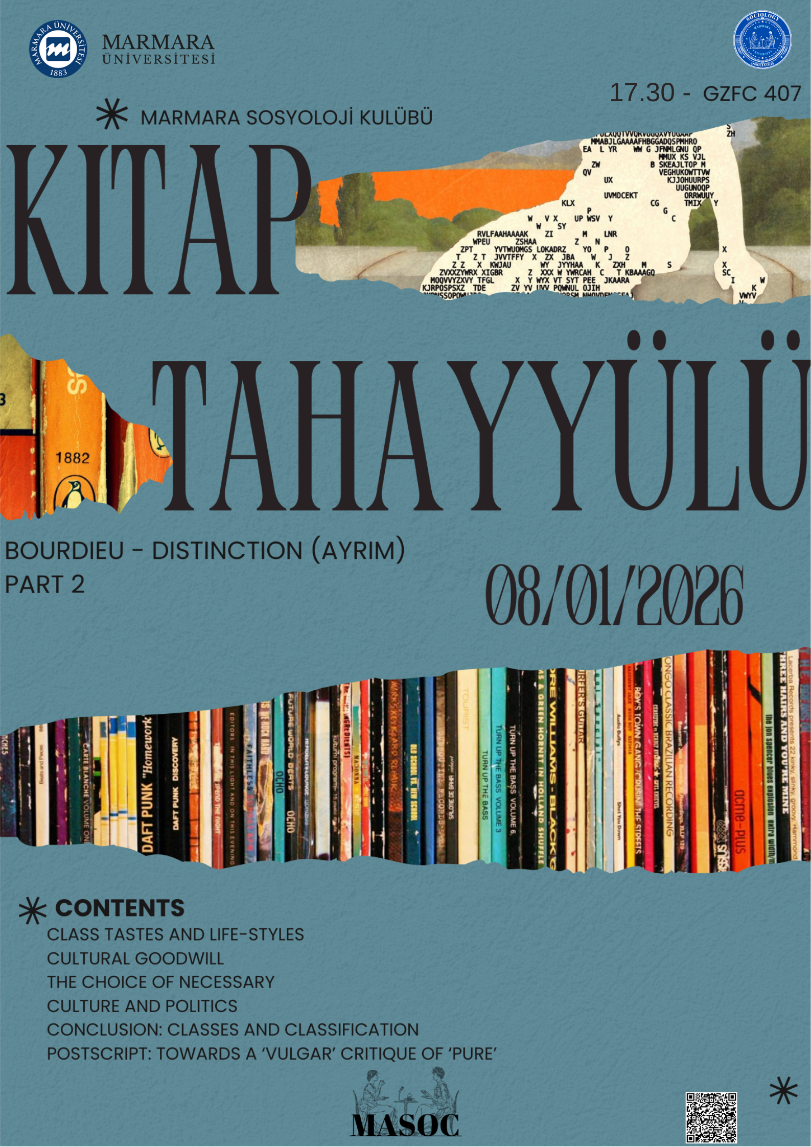 Sosyoloji derslerimizde birçok kitap görüp bunların bazı bölümlerini okuyoruz fakat bir fikri tüm yönleriyle ele almak için bir kitabın birkaç bölümünü okumak yeterli değil. Bu etkinliğin amacı sosyoloji derslerimizde işlediğimiz çok önemli bir yazar olan Pierre Bourdieu'nun Distinctions isimli kitabının ikinci yarısını inceleyerek onun fikirleri hakkında bilgi sahibi olmak ve bu fikirleri bütünlemesine tartışmak. Bu kitabın önerisini Asst. Prof. Nursem Keskin Aksay hocamızdan aldık. Daha önceden kulüp grubumuzda bu kitabın tahlilinin yapılacağını duyurmuştuk bu yüzden hedef kitlemiz kitabı okuyan üyelerimiz, fakat sosyoloji çok geniş bir alan olduğu için yapılan sohbetlerin ve açılan konuların dinleyen herkese katkı sağlayacağını düşündüğümüz için etkinliğimiz kitabı okumuş veya okumamış olan üniversitemizin tüm öğrencilerine, ayrıca katılmak isteyen öğretim üyelerine açıktır. Ayrıca etkinliğimize sosyoloji bölümünden değerli hocamız Arş. Gör. Rumeysa Ertuğrul mentörlük edecektir.