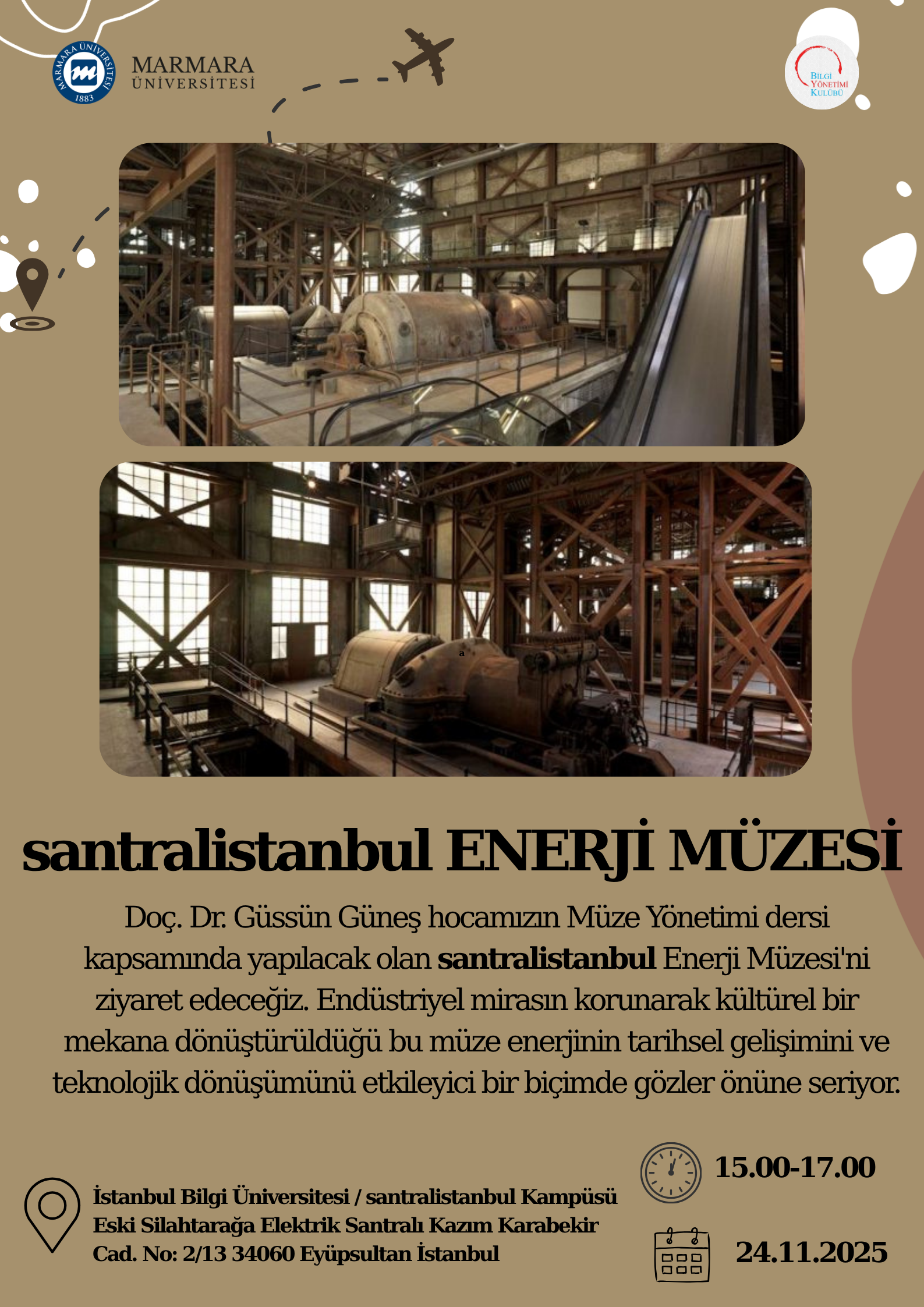 Bilgi Yönetimi Kulübü tarafından planlanan etkinlik, Bilgi ve Belge Yönetimi bölümü Öğretim Üyesi Doç. Dr. Güssün Güneş'in Müze Yönetimi dersi kapsamında 24.11.2025 tarihinde santralistanbul Enerji Müzesi'nin ziyareti planlanmıştır. Endüstriyel mirasın korunduğu bu mekan enerjinin tarihsel gelişimi ve teknolojinin getirdiği dönüşümü göstermektedir. Ziyaret kapsamında Bilgi ve Belge Yönetimi bölümü öğrencileri bu müzenin sergilediği tarihsel enerji üretim araçlarını ve endüstriyel mirası daha geniş kapsamlı bir şekilde inceleme fırsatı bulacaktır.