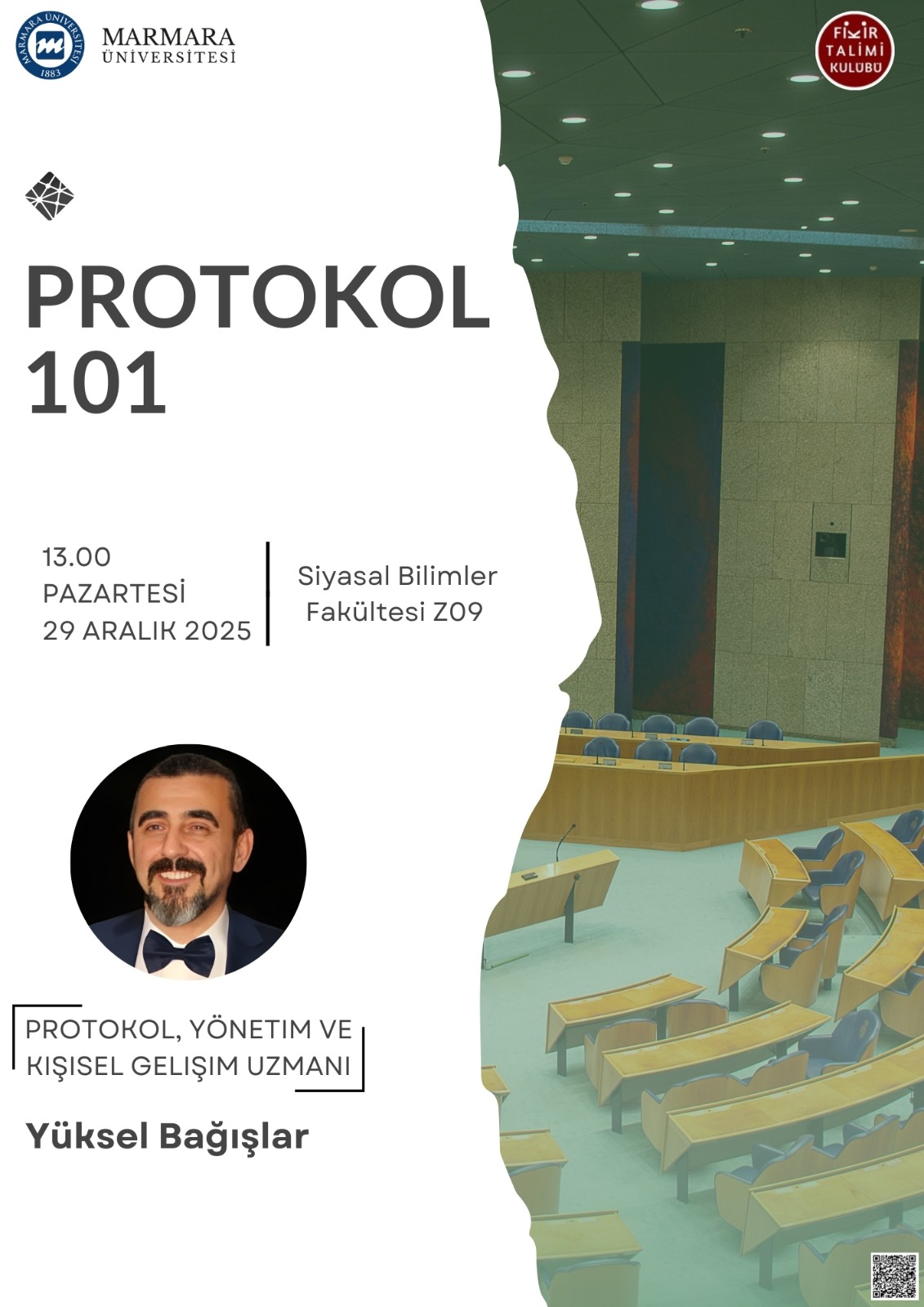 "Protokol 101” etkinliği, katılımcıların resmi ve kurumsal ortamlarda geçerli olan protokol kurallarını, temsil becerilerini ve profesyonel iletişim yöntemlerini doğru şekilde öğrenmelerini amaçlamaktadır. Protokol, yönetim ve kişisel gelişim alanında uzman Yüksel Bağışlar’ın aktaracağı temel prensipler ile öğrencilerin hem akademik hem de profesyonel yaşamlarında gerekli olan temsil yeterliliğini geliştirmeleri hedeflenmektedir. Etkinlik, yöneticilik, kamu yönetimi, diplomasi, organizasyon yönetimi, iletişim ve kişisel gelişim alanlarına ilgi duyan tüm üniversite öğrencilerine yöneliktir.