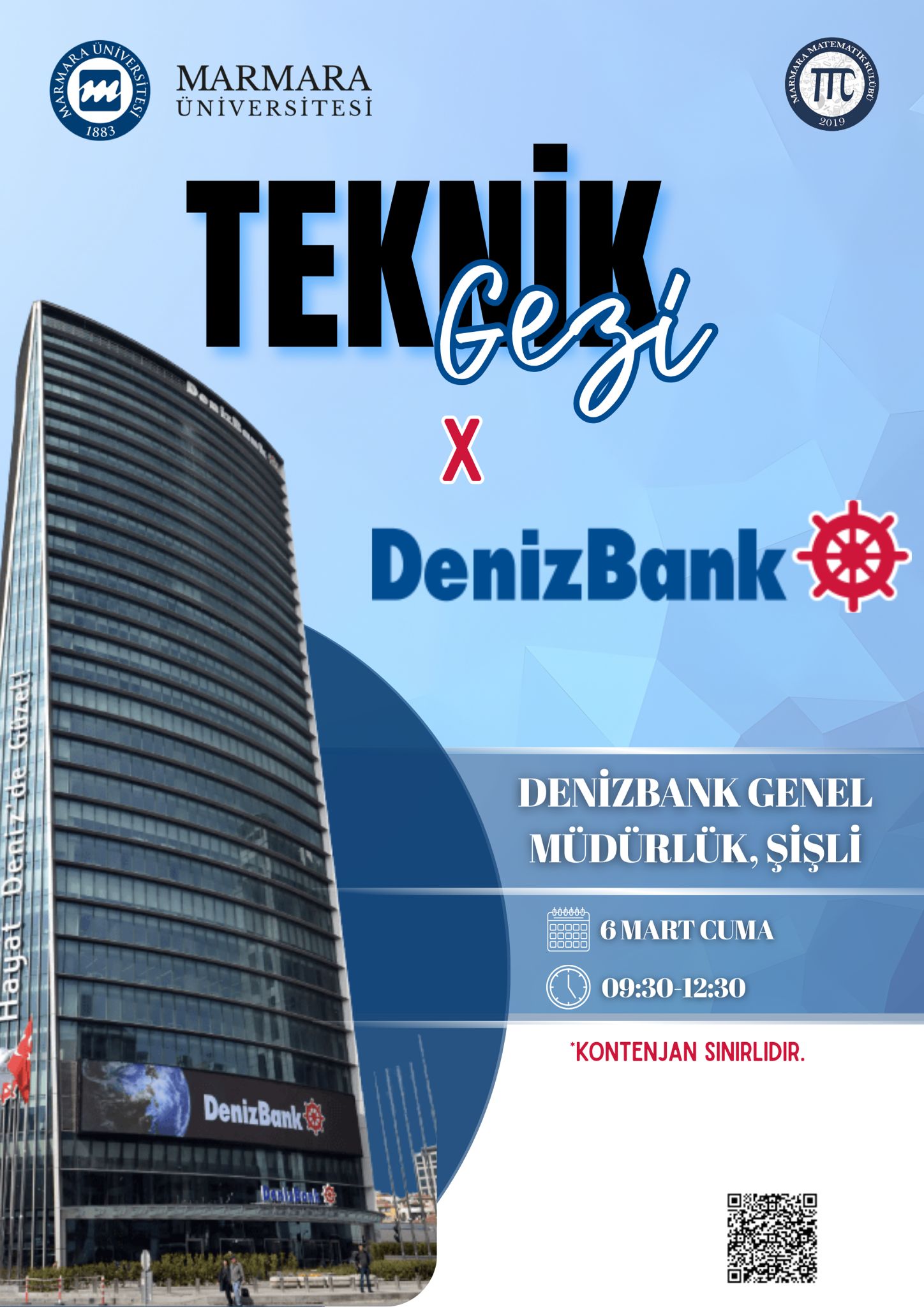 Marmara Matematik Kulübü olarak, öğrencilerimizin teorik matematik bilgilerinin finans sektöründeki uygulama alanlarını yerinde gözlemlemeleri amacıyla 26 Şubat tarihinde DenizBank Genel Müdürlüğü’ne teknik gezi düzenliyoruz. Etkinlik kapsamında, veri analitiği ve finansal modelleme süreçlerinin bankacılık operasyonlarındaki rolü incelenecektir. Sektör profesyonelleriyle yapılacak görüşmelerle katılımcıların kariyer hedeflerine katkı sağlanması ve profesyonel vizyon geliştirilmesi hedeflenmektedir.