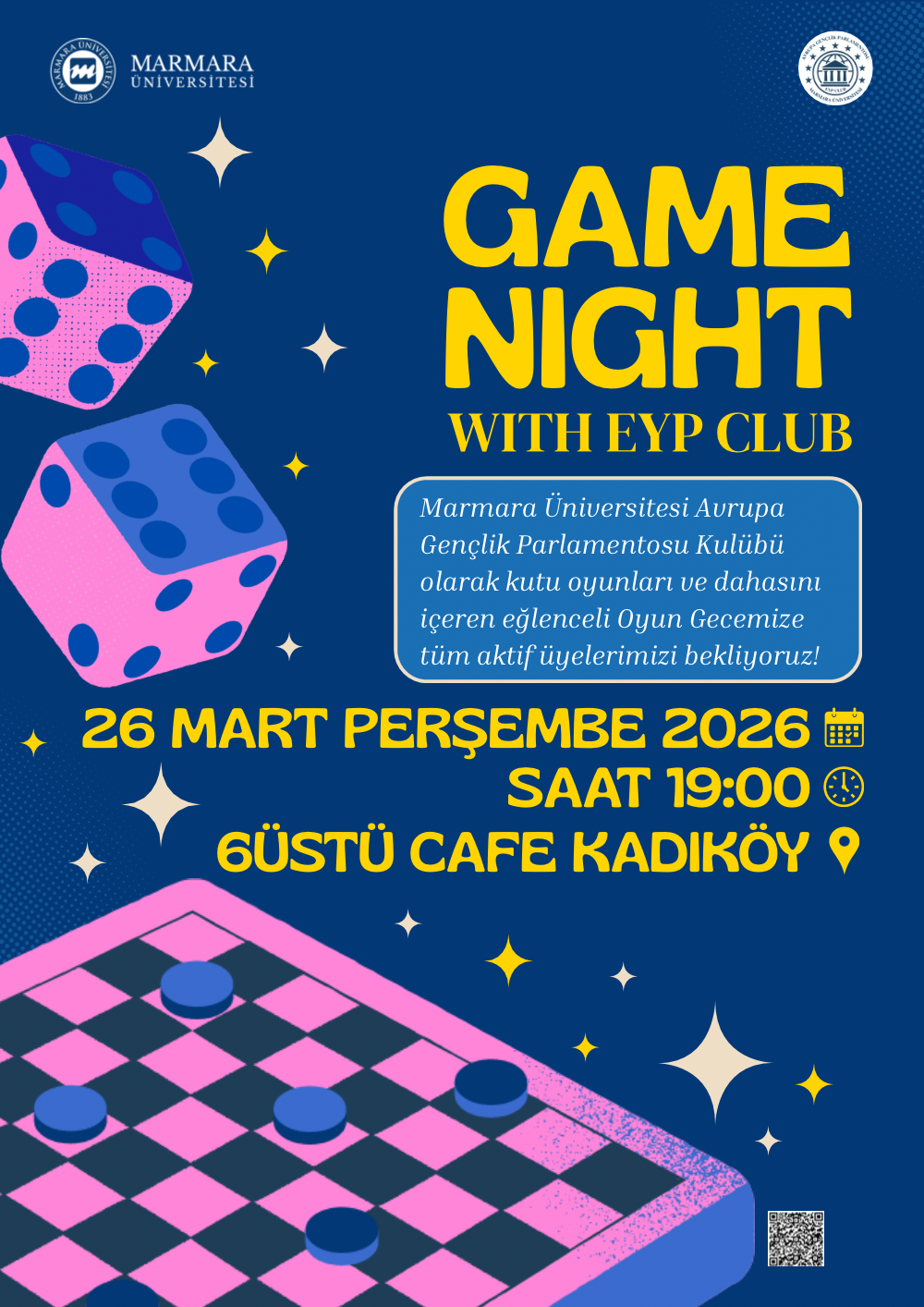 • 26.03.2026-19:00:21:00 | Üniversite Dışı Faaliyetler / Üniversite Dışı 6 Üstü Kafe Kadıköy - Caferağa, Sarraf Ali Sk. Kutu oyunları, satranç gibi birçok oyun bulunan Kadıköy 6 Üstü Kafe'de eğlenceli bir oyun gecesi geçireceğiz.