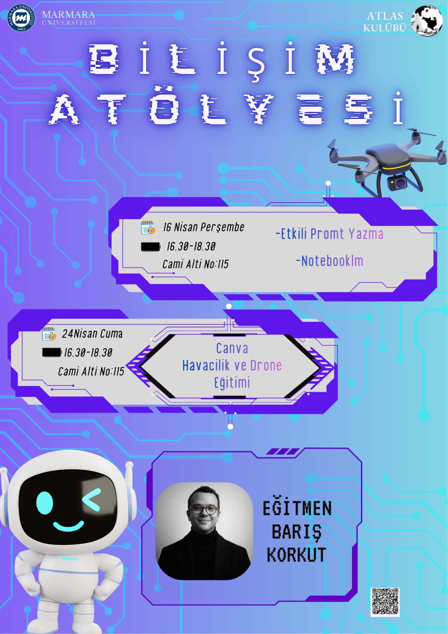 Bu etkinliğimizde günümüzde hızla gelişen teknoloji, yapay zeka ve dijitalleşme süreçlerini ele almak istiyoruz. Öğrencilerimizin çağın gereksinimlerine uygun teknik beceriler ve dijital okuryazarlık kazanmasını sağlamak amacıyla düzenlemek istiyoruz. Etkili prompt yazma, NotebookLM kullanımı, Canva ile tasarım, havacılık ve drone eğitimini içeren bu bilişim atölyesi konularını, Eğitmen Barış Korkut ile birlikte iki farklı oturumda ele almayı hedeflemekteyiz. Bu etkinliğe katılan Marmara Üniversitesi öğrencileri ile beraber, yapay zeka araçları ve dijital tasarım konularında pratik yetkinlikler ve yeni bir vizyon kazandırmayı amaçlıyoruz. Bu etkinliğimiz Marmara Üniversitesi öğrencilerine yöneliktir.