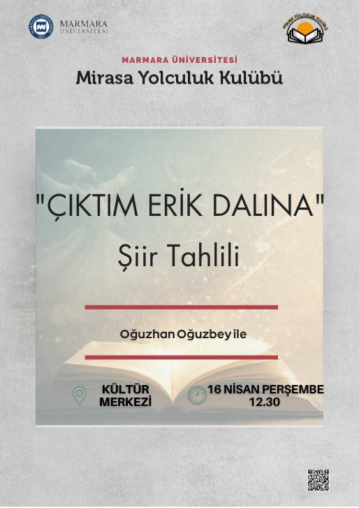 Etkinliğin amacı, “Çıktım Erik Dalına” şiiri üzerinden katılımcılara şiir tahlili becerisi kazandırmanın yanı sıra, şiir aracılığıyla medeniyetimizin düşünce, dil ve anlam dünyasını daha yakından tanımalarını sağlamaktır. Söz konusu şiir, ilk bakışta alışılmış anlam düzenini zorlayan ifadeleriyle dikkat çekmekte; okuyucuyu kelimelerin görünen anlamlarının ötesini düşünmeye yönlendirmektedir. Programda şiir okunarak imge, tema ve kavramsal arka plan açısından değerlendirilecek; katılımcıların metni yüzeyselliğin ötesinde okuyabilme becerileri geliştirilecektir. Hedef kitle, başta Marmara Üniversitesi İlahiyat Fakültesi öğrencileri olmak üzere edebiyata ve düşünsel okumaya ilgi duyan üniversite öğrencileridir. Etkinliğin temel hedefi, katılımcıların eleştirel düşünme, yorumlama ve anlamlandırma becerilerini güçlendirmek ve Mirasa Yolculuk Kulübü’nün medeniyet perspektifi doğrultusunda kültürel farkındalıklarını artırmaktır.