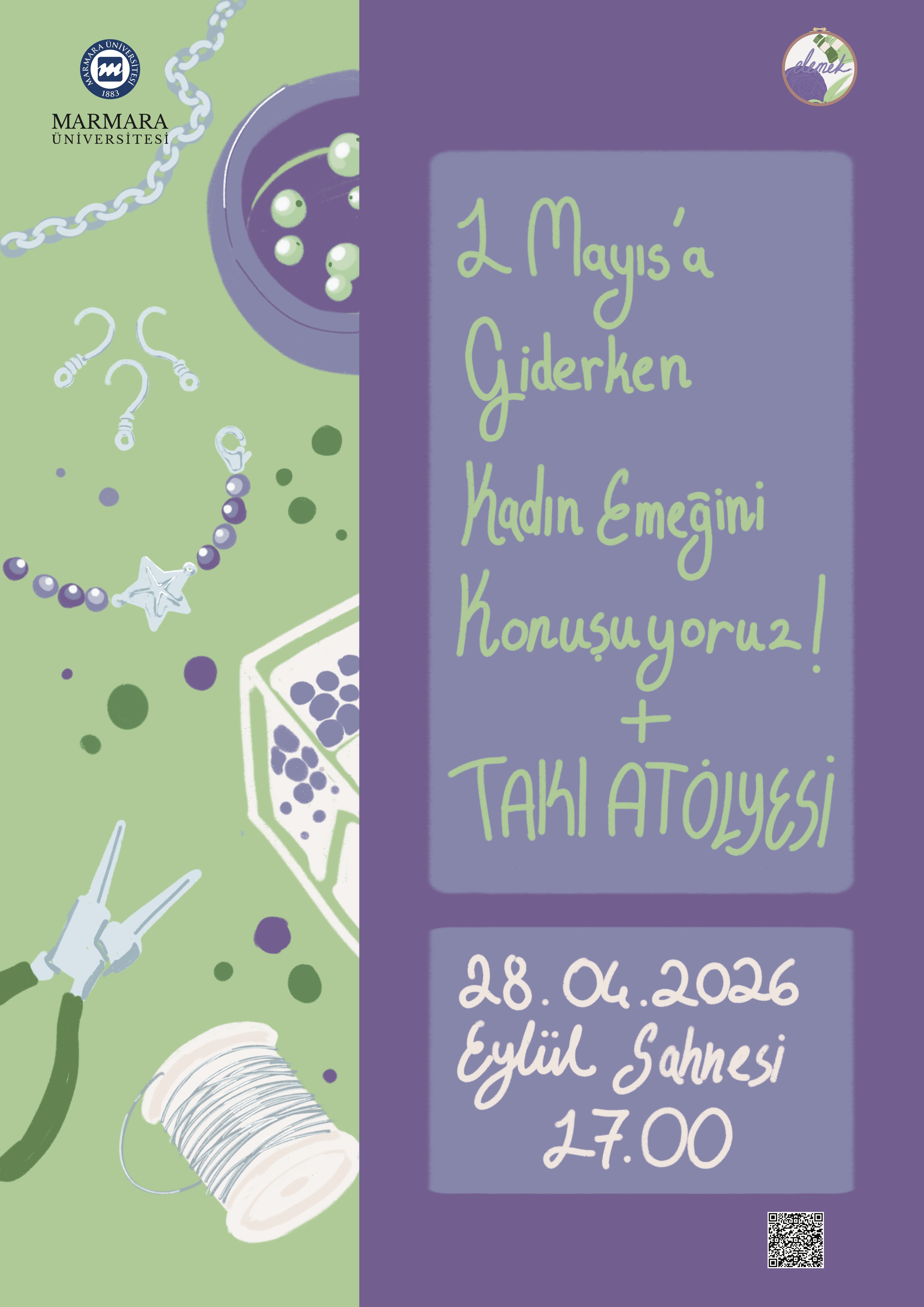 İşçi Bayramı yaklaşırken günlük hayatımızda kadın emeğini gördüğümüz ve göremediğimiz şekillerde hatırlamanın, bu konuda bilinçlenmenin önemli olduğuna inanıyoruz. Bu sebeple sıra arkadaşlarımızla bir araya geliyor kadın emeğinin her halini konuşuyoruz. Bunun ardından kndi emeğimizle bir ürün ortaya koyma amacıyla hep beraber takı yapıyoruz. Bu etkinlik sayesinde arkadaşlarımızda ve kendimizde el emeğinin görünürleşmesini sağlamayı amaçlıyoruz.