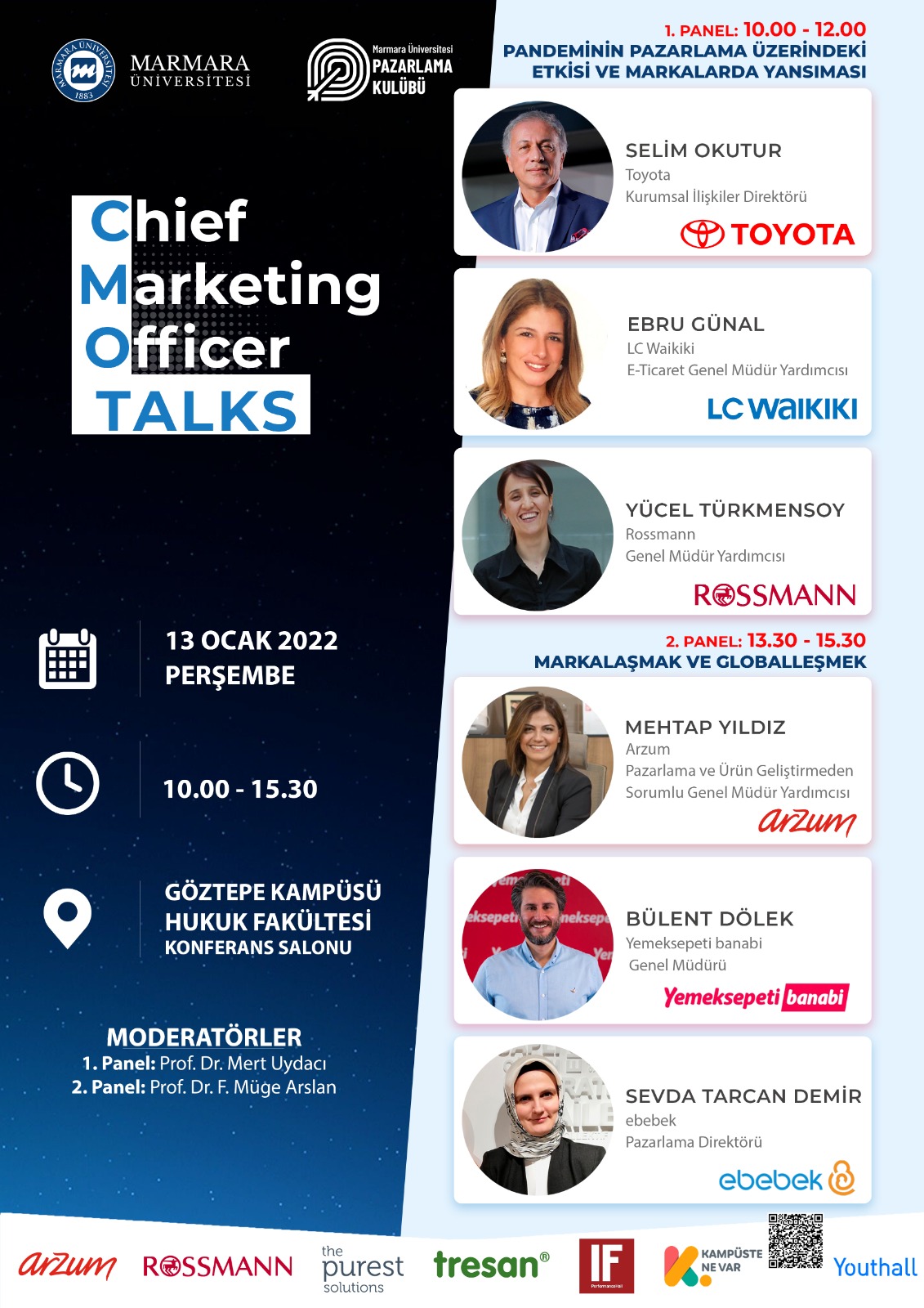 Kulübümüzün bu sene ilkini gerçekleştireceği CMO-Talks Zirvesi ile ülkemizde alanında uzman Pazarlama Direktörlerimizi Marmara Üniversitesi öğrencilerimiz ile buluşturmayı hedefliyoruz. Etkinliğimiz 13 Ocak Günü Göztepe Kamüsü Hukuk Fakültesi Konferans Salonu'nda gerçekleştireceğimiz etkinlikte Pazarlama Koordinatörleri bizlere sunumlarını yapacak, öğrencilerin sorularını cevaplayacaklardır.