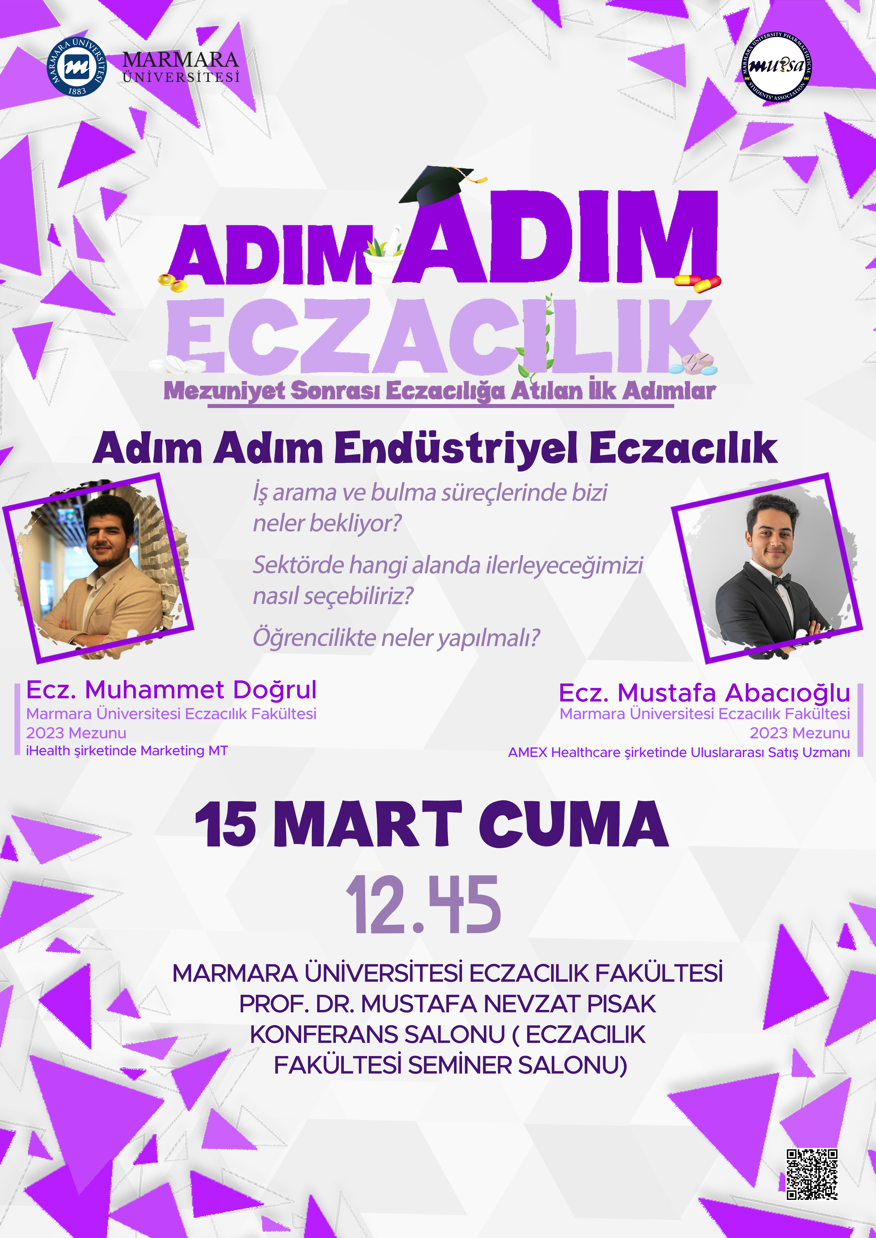 Marmara Üniversitesi Eczacılık Fakültesi mezunları Ecz. Muhammet Doğrul ve Ecz. Mustafa Abacıoğlu endüstriyel eczacılık üzerine konuşma gerçekleştirecektir. İş arama süreçleri, sektörde eczacının yeri, eczacının çalışabileceği alanlar, öğrencilikte yapılması gerekenlerden bahsedilecektir. Etkinliğin amacı, öğrencilerin endüstri ile ilgili bilgilerini arttırmak, staj dönemlerine destek olmaktır. Etkinliğim hedef kitlesi, eczacılık öğrencileridir.