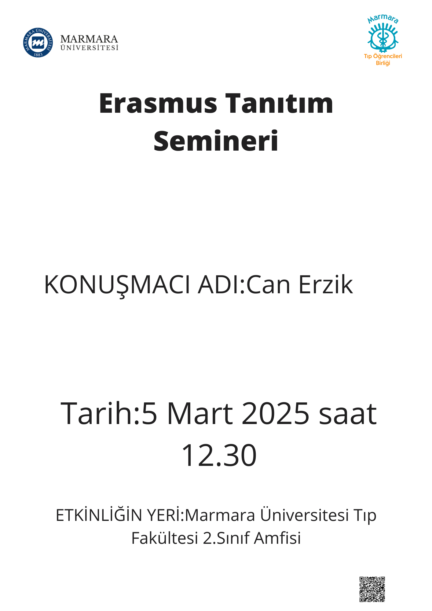 Erasmus ile yurt dışı stajlarının işleyişi, içeriği, şartları ve başvurma hususunda gerekenler ile ilgili tanıtımın olacağı bu etkinliğimizde tıbbi biyoloji ana bilim dalında görev alan Dr. Öğr. Üyesi Can Erzik hocamız tanıtımımızı gerçekleştirecektir. Amacımız tıpta genel olarak az bilinen Erasmus programını öğrencilerimize açıklamak ve tanıtmaktır.