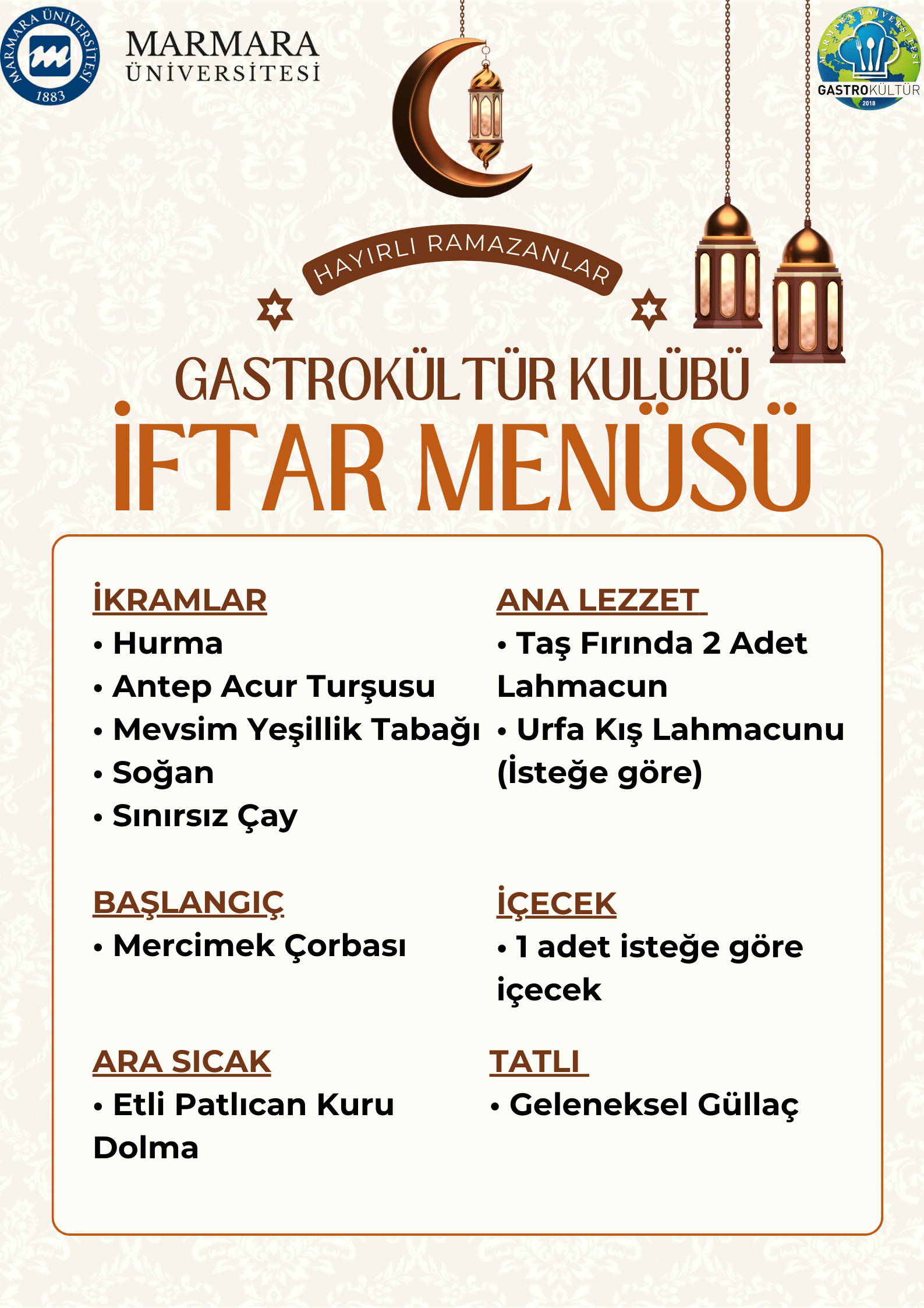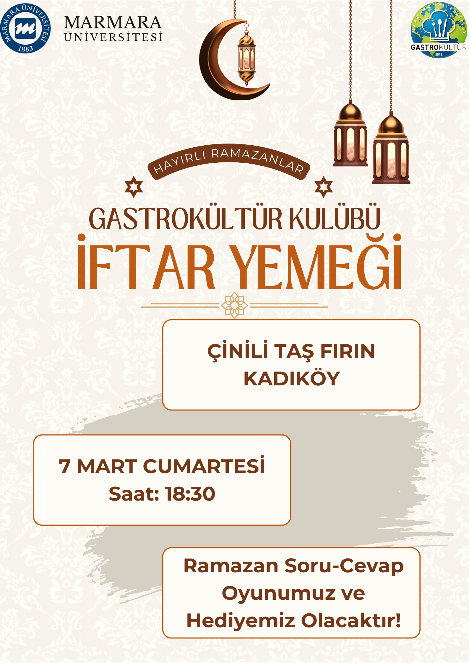 Gastrokültür Kulübü tarafından düzenlenen iftar yemeğinin amacı; Ramazan ayının paylaşma, dayanışma ve birlik ruhunu üniversite ortamında birlikte yaşamak ve öğrenciler arasındaki sosyal bağları güçlendirmektir. Bu etkinlik ile farklı bölümlerden öğrencilerin bir araya gelerek kültürel değerleri paylaşması, kulüp içi etkileşimin artması ve aidiyet duygusunun pekişmesi hedeflenmektedir. Program kapsamında gerçekleştirilecek soru-cevap oyunu ile katılımcıların hem keyifli vakit geçirmesi hem de Ramazan ayına dair bilgi ve farkındalıklarının artırılması amaçlanmaktadır.