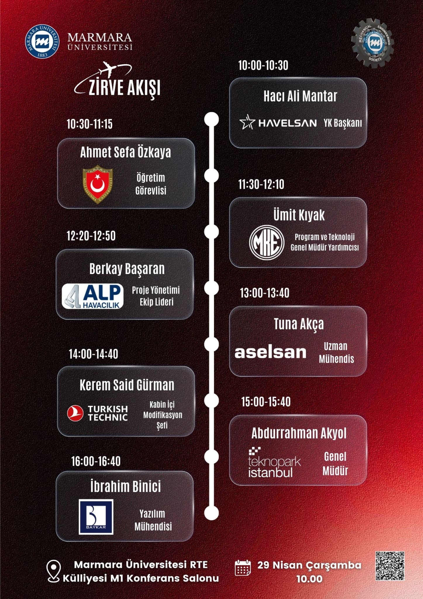 - 29.04.2026-10:00:17:00 | Derslik/Amfi/Laboratuvar/Diğer7 / Recep Tayyip Erdoğan Külliyesi Maltepe Yerleşkesi M1 Binası Konferans Salonu Savunma Sanayi Zirvesi/ Sohbet-Söyleşi-Kariyer Günleri